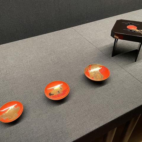 老松尉姥鶴亀蒔絵三組盃と真塗花月台