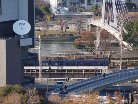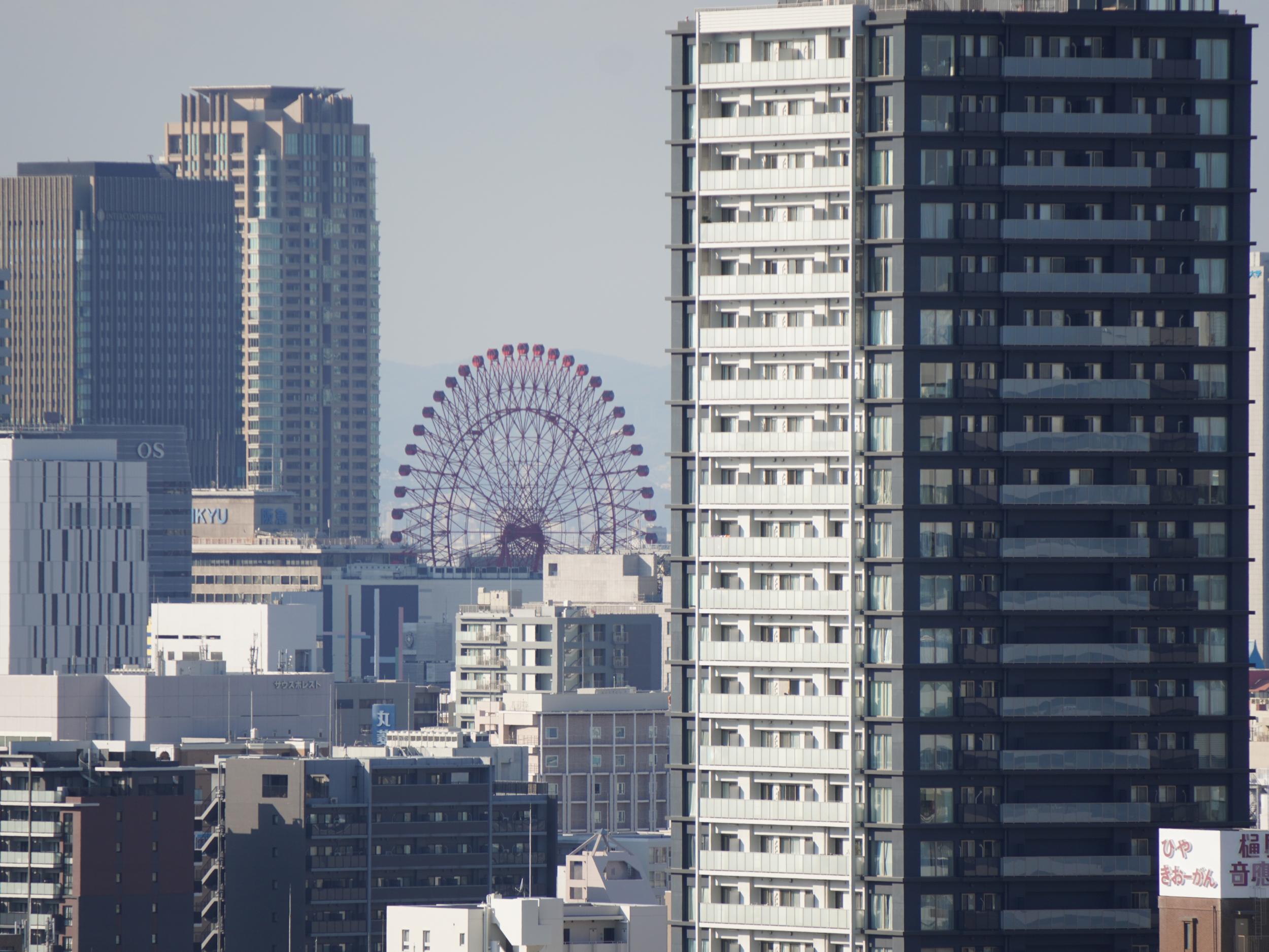 北側の景色です。よーく見ると太陽の塔が写ってました!まずエキスポシティのオオサカホイールが見つかるはず、その左手です。太陽の塔に赤い丸を付けてみました。