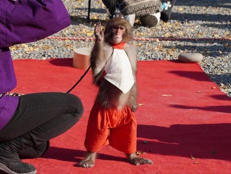 ジオラマとCGを合成した「からくり太閤記」。白装束に烏帽子の秀吉が町衆を招いた茶会の場面と、方広寺大仏殿を見て驚く京の町衆の場面。