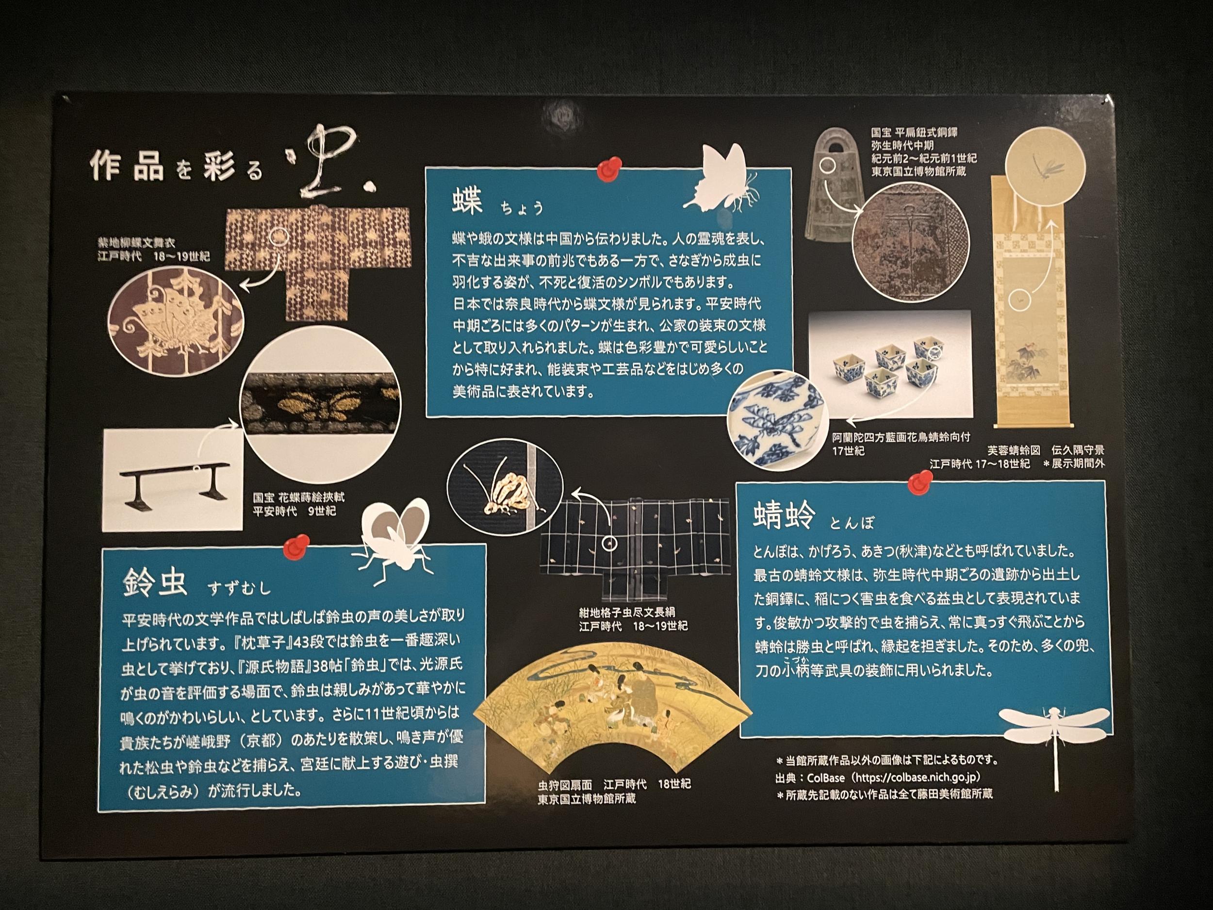「作品を彩る虫」のパネル、奈良時代から蝶が文様として工芸化したこと、平安時代の貴族が嵯峨野で鳴き声が優れた鈴虫を捕まえる「虫撰」に興じていたこと、常にまっすぐ飛ぶので勝虫と呼ばれたトンボが兜にも取り入れられるようなっとたこと、いずれも興味深い。