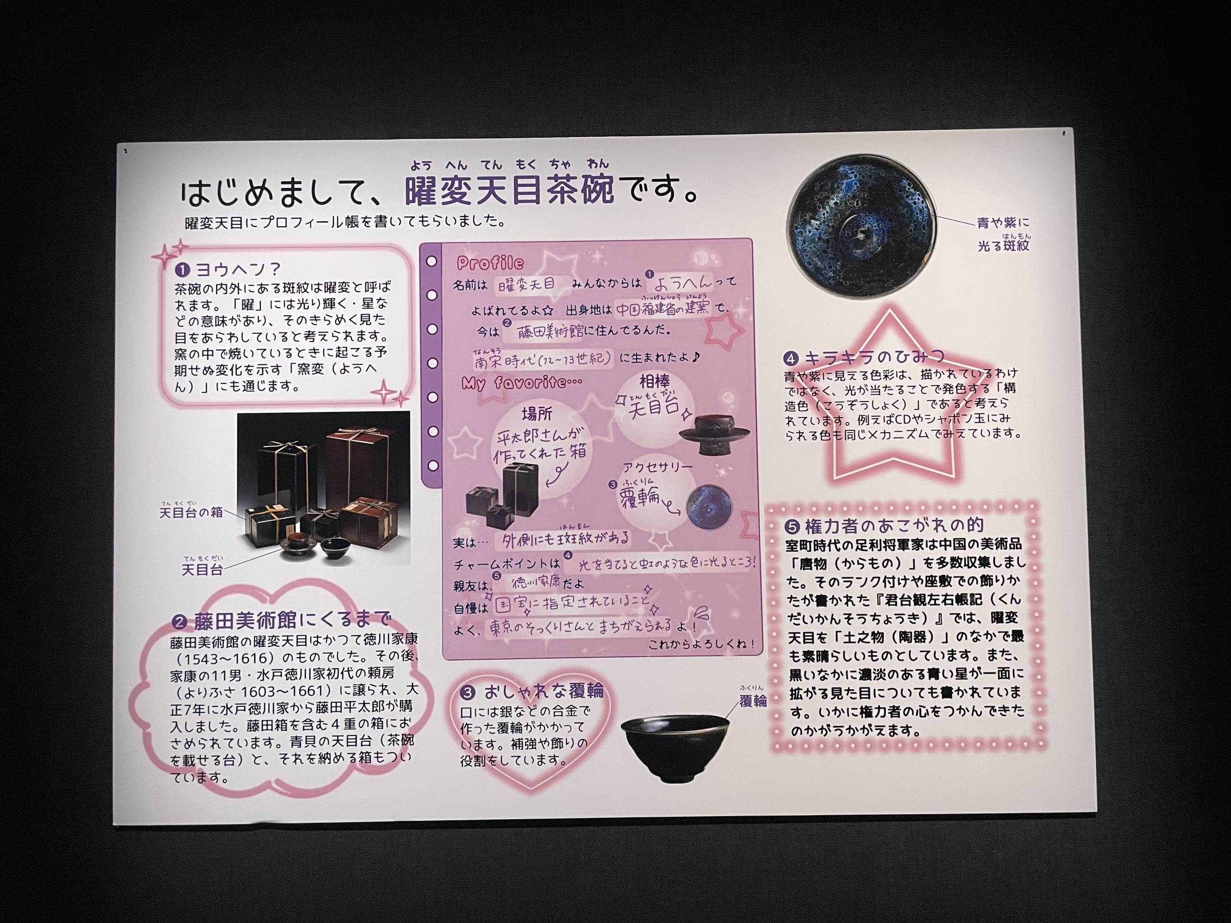 もう一度「誂」へ。曜変天目の解説パネルにはピンクの星やハートがキラキラ、曜変推しのJKさんがまとめてくれたもののようです。座談会でも話されていた若い人たちに来てほしいという思いがここに。