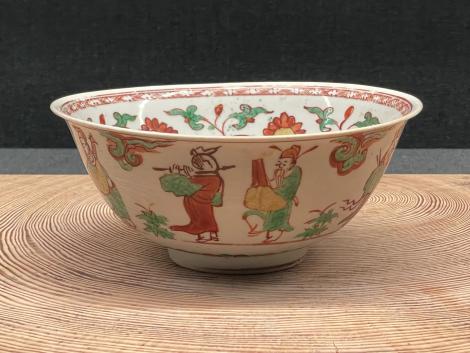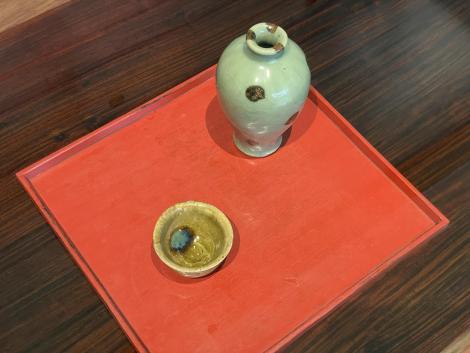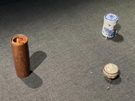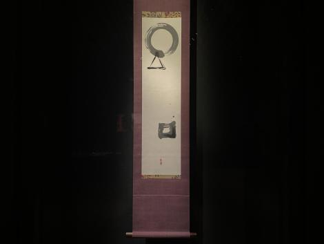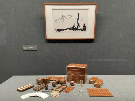 同じ展示ケースの左下に17世紀明代の「色絵古銅三ツ人形蓋置」。元々墨を置く台だったものを、茶釜の蓋や柄杓を置くための蓋置に茶人たちが転用したそうな。表情があるかのような「日々是好日」の書と、明代の子どもたちが挨拶を交わしているかのような空間を演出。