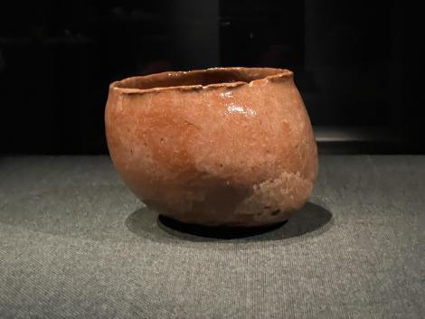 曜変天目が展示されていなかった5月に藤田美術館を訪ねた時、樂道入(楽家3代目、ノンコウ)の黒樂茶碗を鑑賞しています。 黒樂茶碗も赤楽茶碗もろくろを使わない手捏ね。黒楽は鉄釉を何度もかけて焼成、赤楽は赤土に透明の釉薬をかけて低めの温度で焼成したものらしい。総合芸術家であった本阿弥光悦は楽家の技法を学び作陶、楽焼の派生ではあるものの、より自由奔放に美意識を昇華させており、この銘文億にそれが存分に発揮されていると感じさせます。手捏ねでよくここまで薄く仕上げたと感じ入るものの、デコボコの口縁で飲みにくそう、ストローが要るかも。
