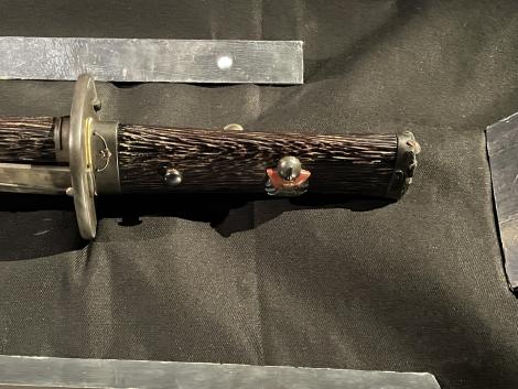 座右の目と同じケースに「黒漆木目地脇差拵」、柄の目貫には福助らしいフィギュア、鍔の裏側に鬼のような浮彫と羽織を着て座っている小さな動物、さらに柄頭にはウサギさん。反対側は福助の後姿。