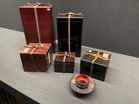 香りを聞き名前を当てるゲーム「組香」セット、若松梅蒔絵十種香箱(江戸時代17〜18世紀)。パネルで各部品の役割やゲームのルールも詳しく説明。セットに肝心の香木は含まれておらず、香木を焚くための様々な道具と、投票するための道具一式です。