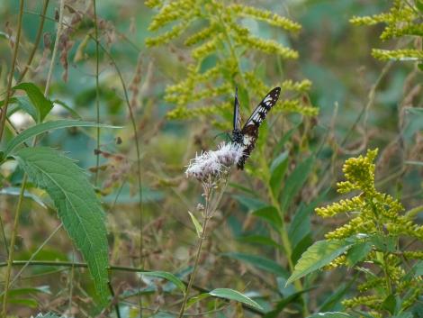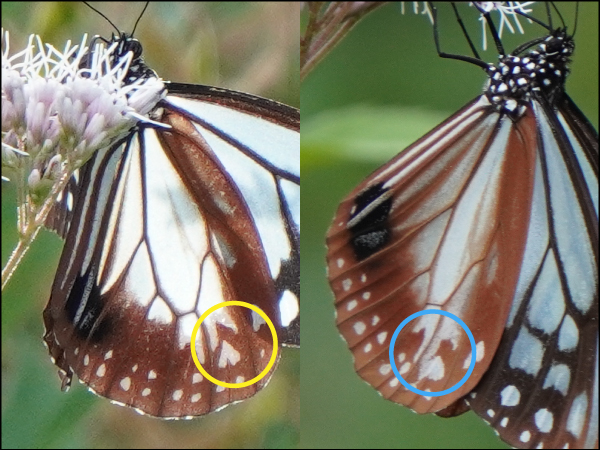 アサギマダラはフジバカマの陰にいました。1時間前に見たコと同じかと思いきや、よぉく見ると翅の模様が微妙に違っていて別のコです。左後翅外側の比較、左が1時間前のコ、右が上のコです。意外と個体差が大きくてビックリです。