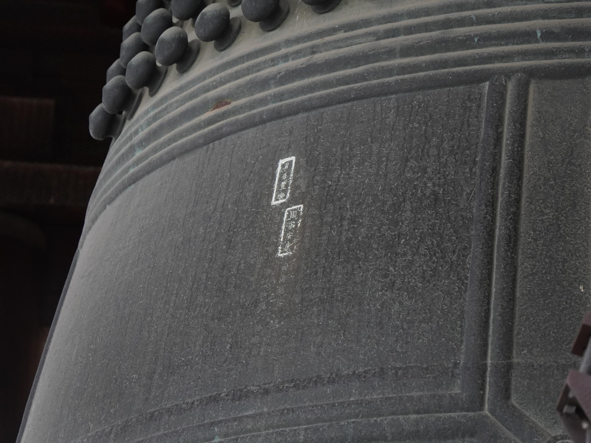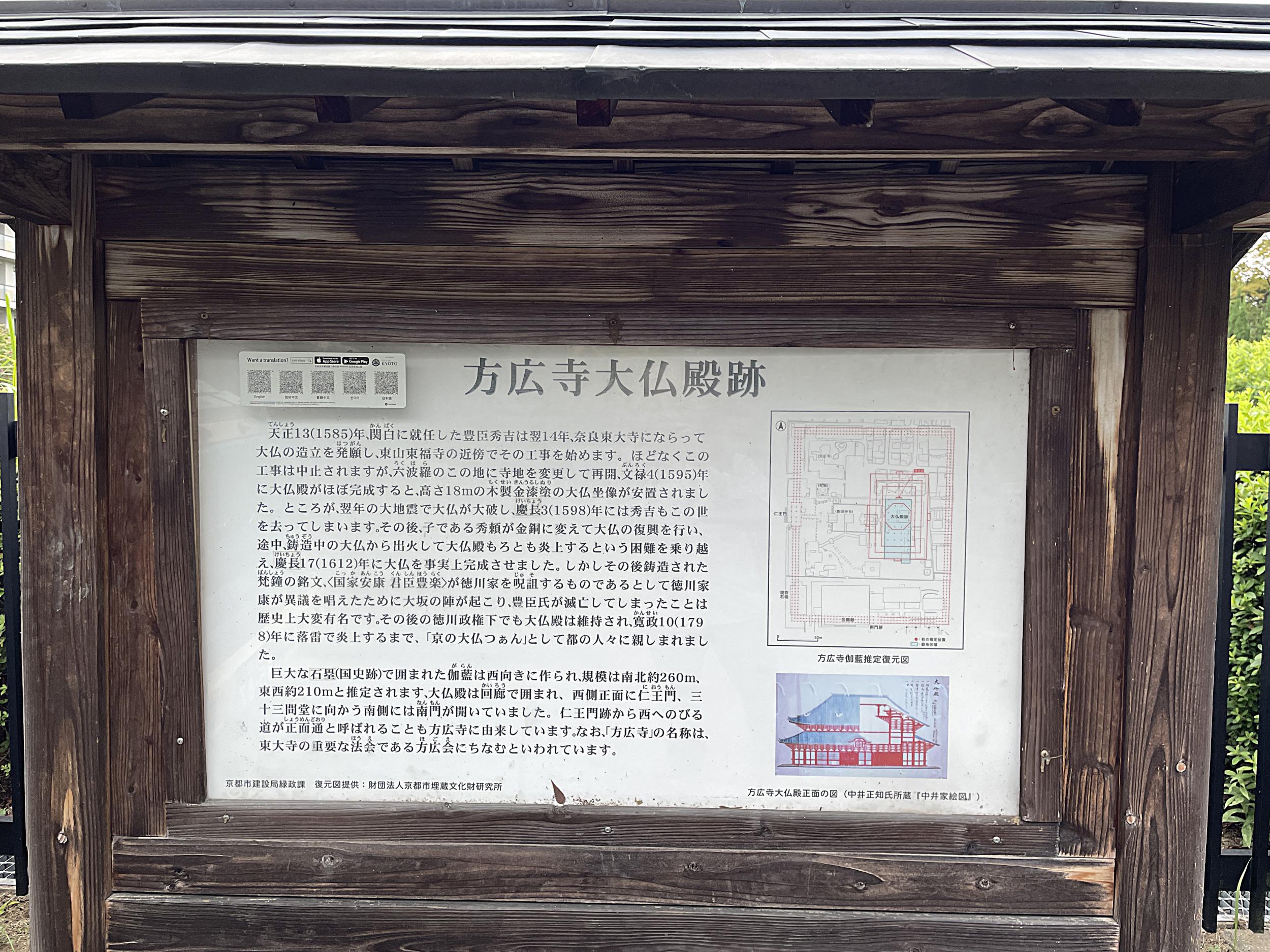 木造の初代大仏は慶長伏見大地震で損壊、「自身の身すら守れない大仏が人びとを救えるはずもない」と秀吉の命で解体。2代目大仏は秀頼により銅製で慶長17年(1612年)に再建、梵鐘が完成したのは慶長19年、梵鐘の問題箇所をすりつぶせば良いとの家康の内意があったらしいものの、今も残されています。方広寺梵鐘事件は大阪攻めのための単なるいいがかりであったことの証左となるようです。この2代目は寛文2年(1662年)若狭近江地震で損壊し取り壊されます。