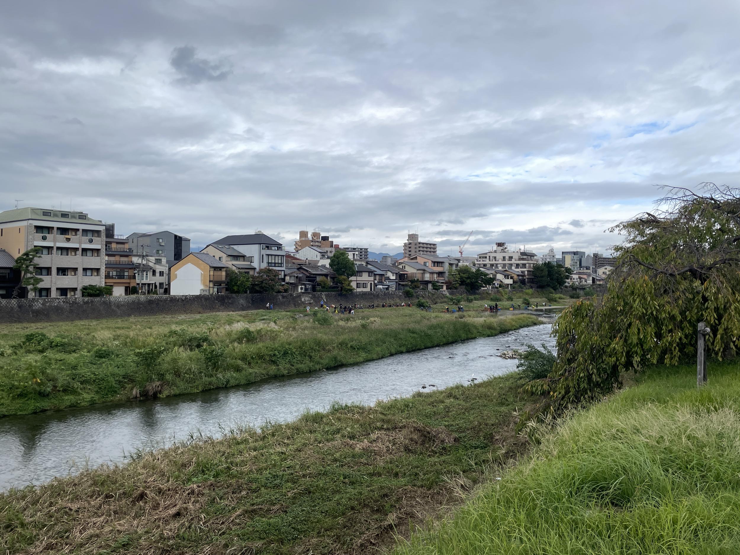 アサギマダラの前に訪ねてみたい場所があって京阪七条で下車。鴨川の河原の草むらに大勢の人々、清掃活動のようです。