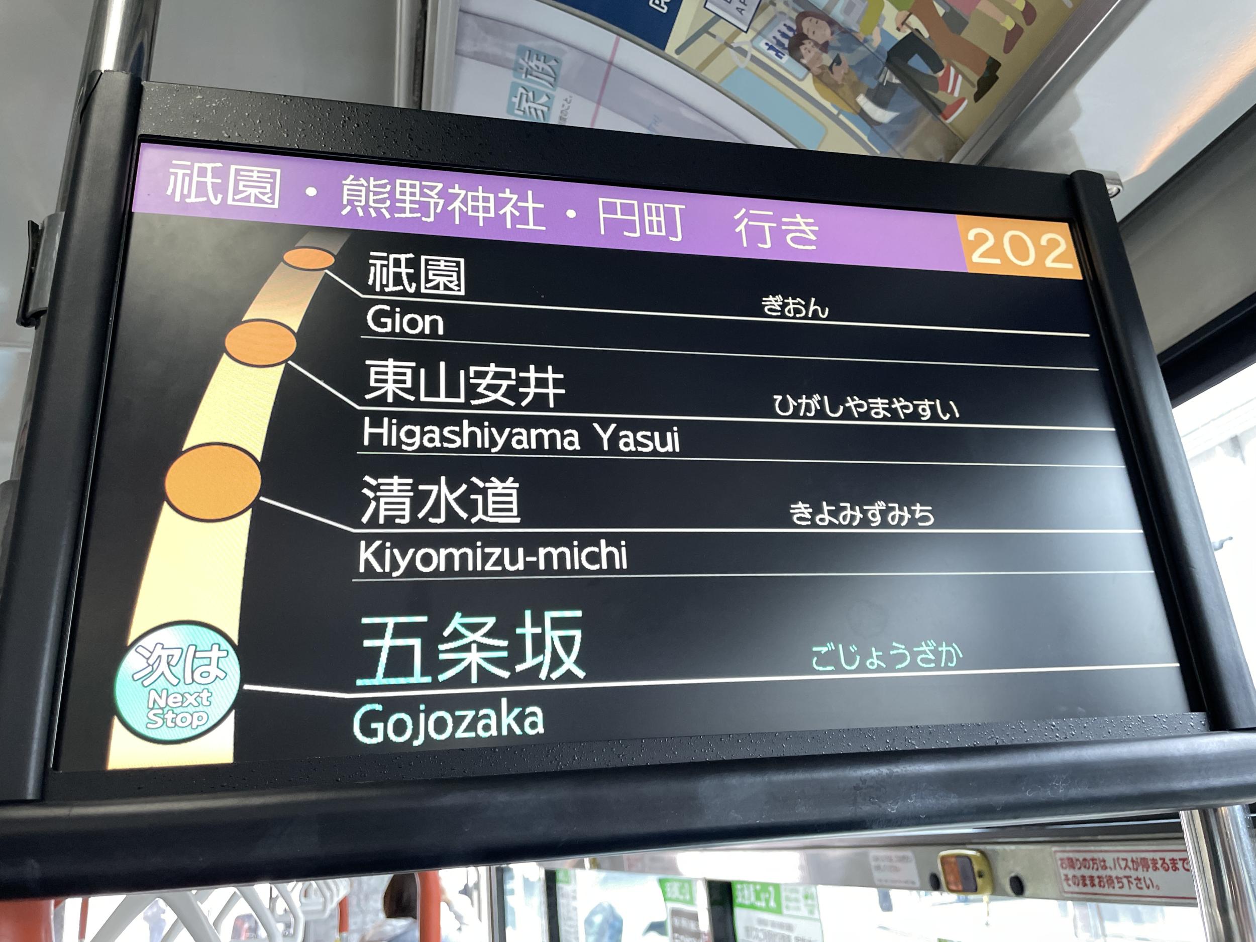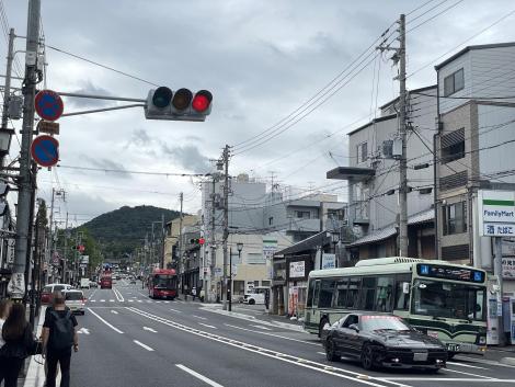 七条通を東へ。突き当りは智積院、向こうの山は阿弥陀ヶ峰、山頂に豊臣秀吉の廟所、豊国廟があります。2台の赤いバスは京都駅や四条河原町と京都女子大を高頻度で結んでいるプリンセスラインという路線バス。