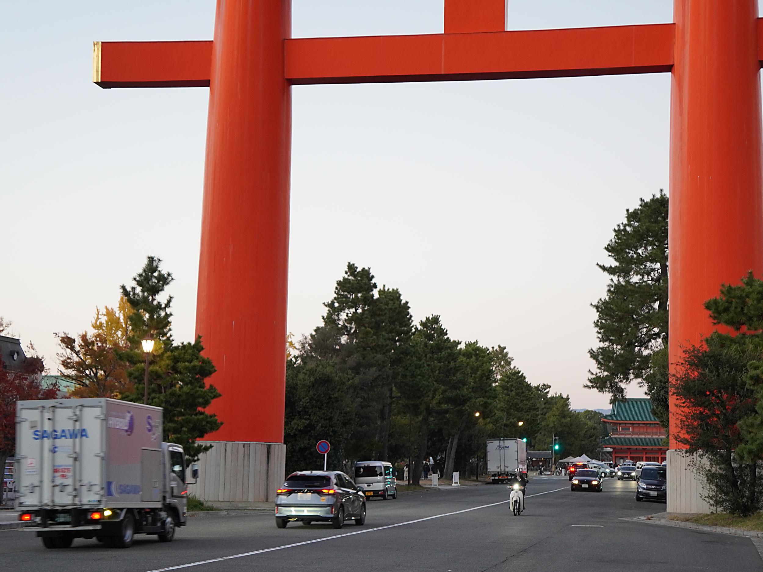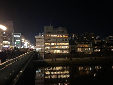 岡崎公園のバス停は長〜い行列で諦めて、白川沿いを抜けて東山仁王門バス停へ。最初の206系統京都駅行は超満員で乗れず、次の202系統東福寺行はルート検索でリストされなかったので見送り、その次の206系統になんとか乗れました。もう5時を回ってしまい、三十三間堂の夜間特別拝観が始まっています。