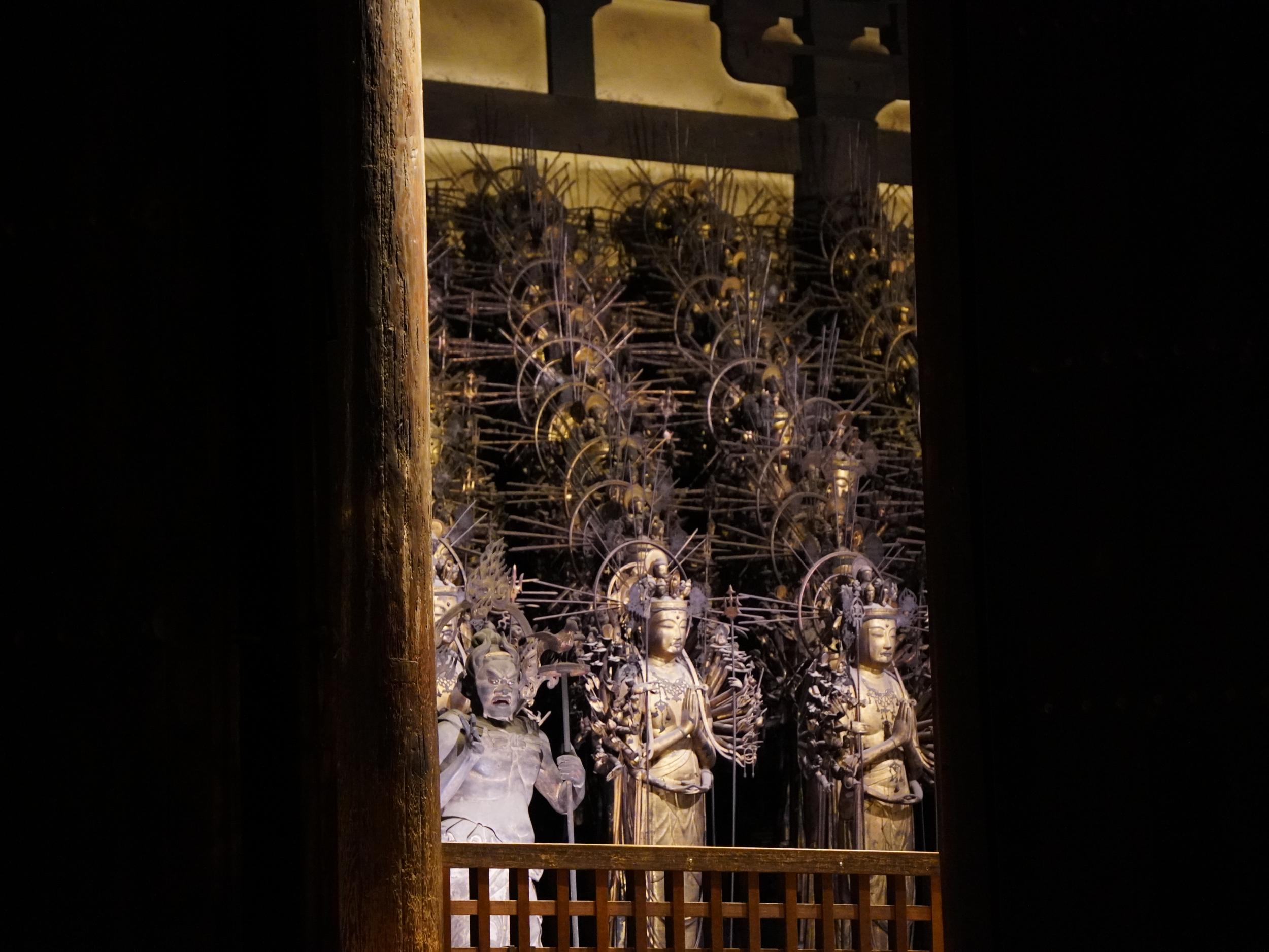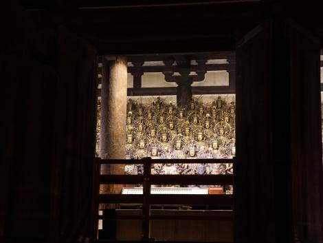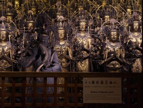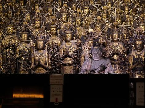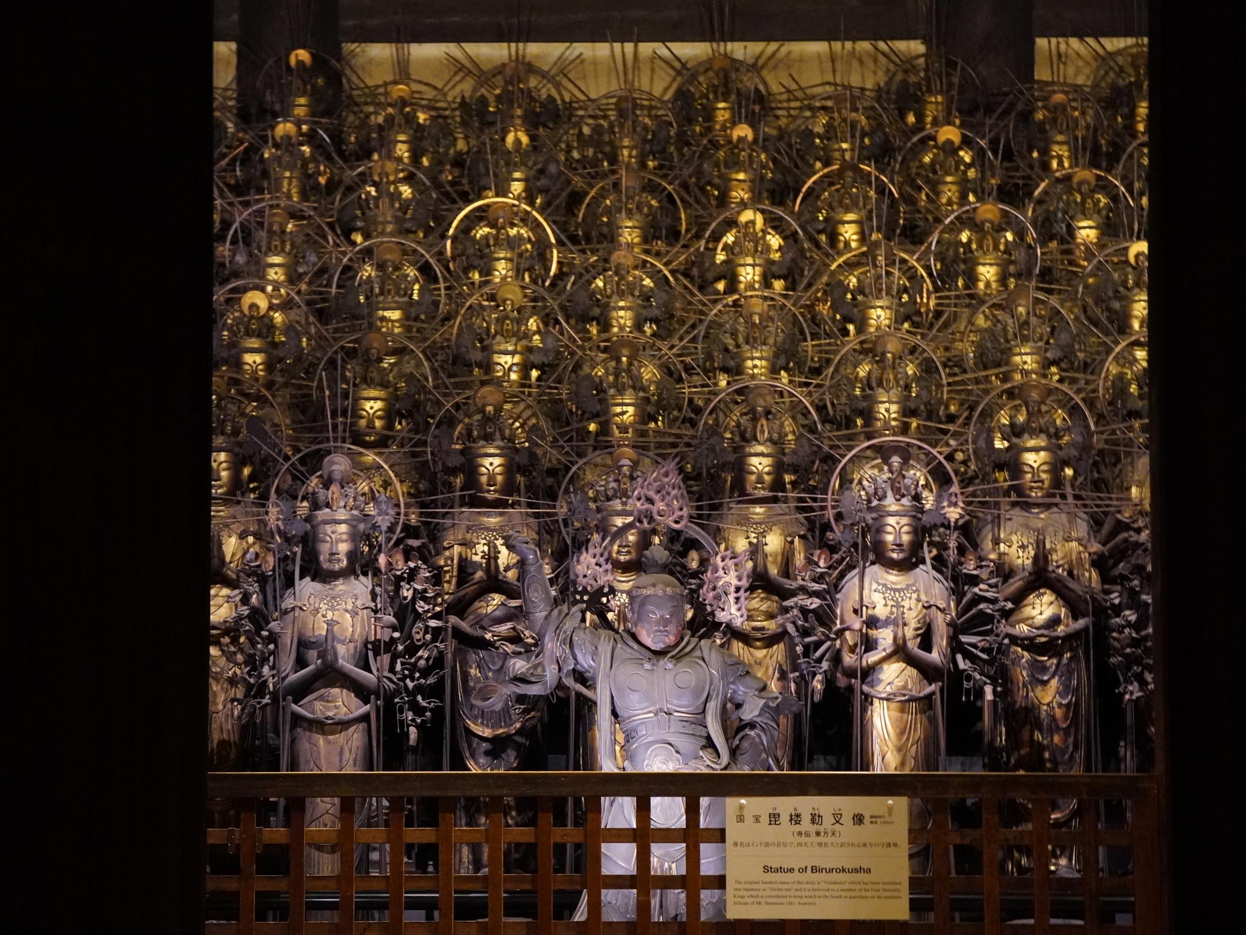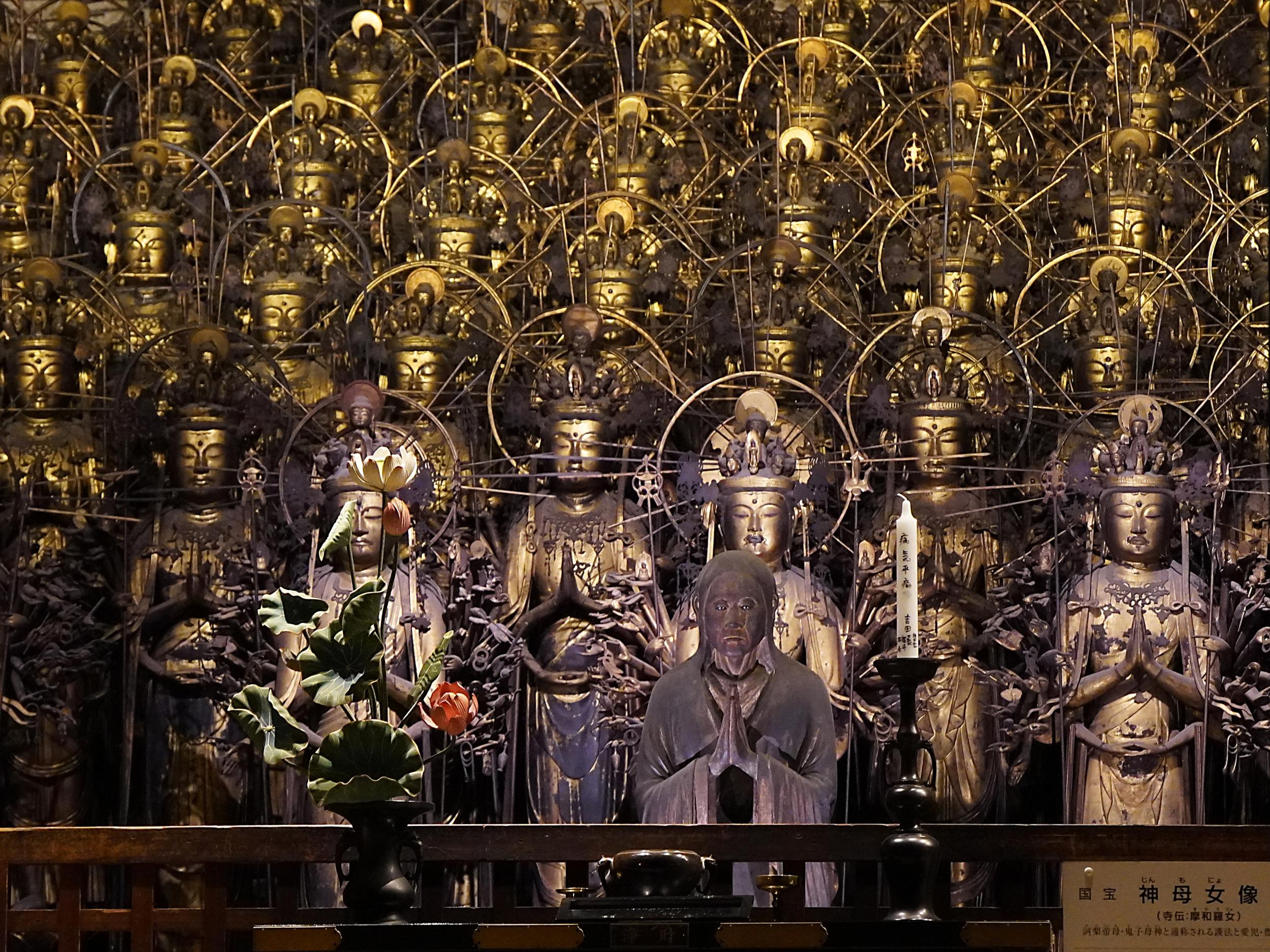 斜めに見ると一直線に並んでいる千体千手観音立像。1から1001の番号が振られており、左端(南側)最上段が1号像、左端最下段が10号像、右端最上段が991号像、右端最下段が1000号像。本尊背後に立つ夜間特別拝観で唯一見えない1001号像があります。度々火災にも運び出され、金箔に覆われたままよくぞ今に伝わったものです。