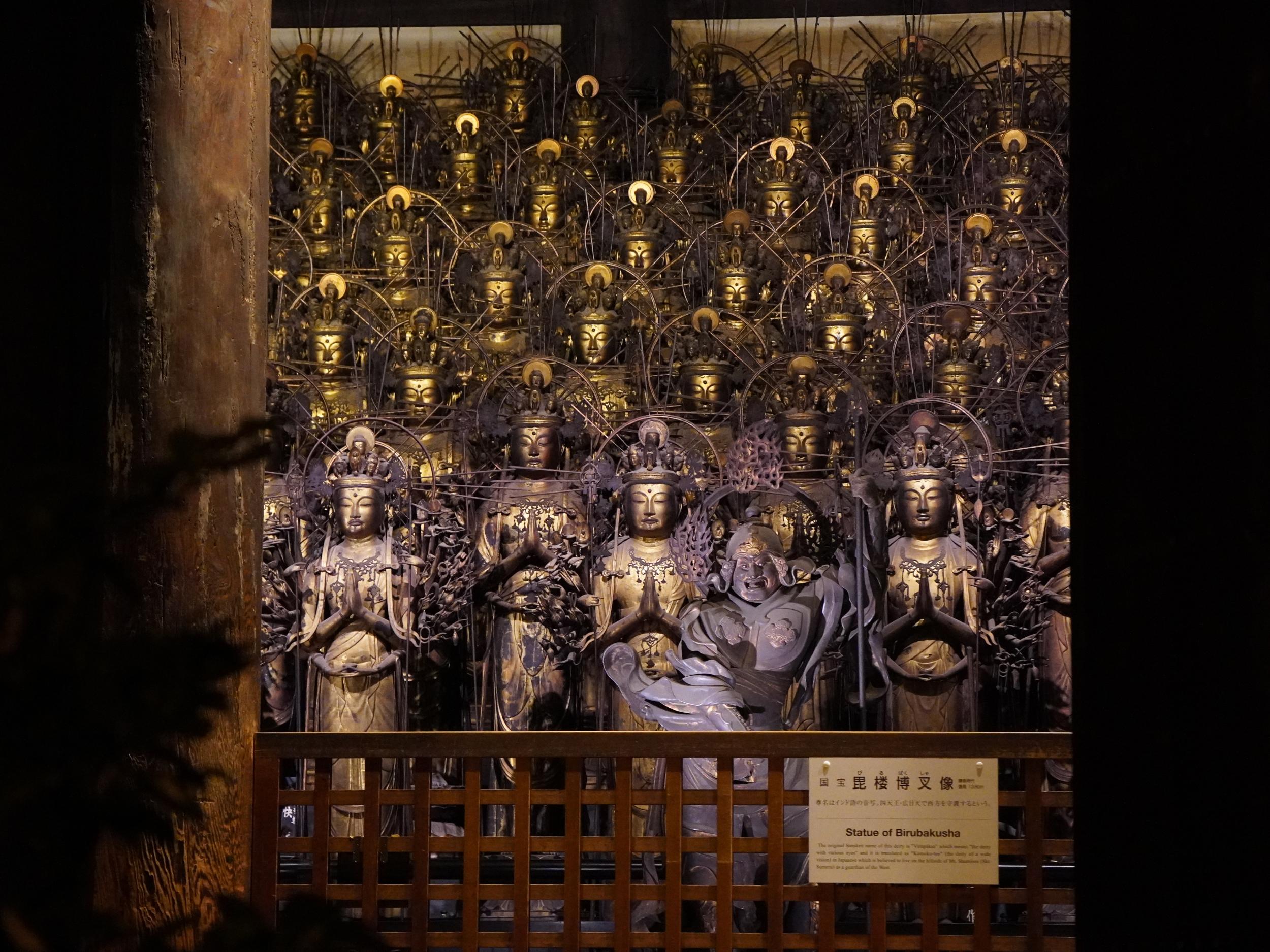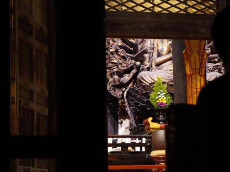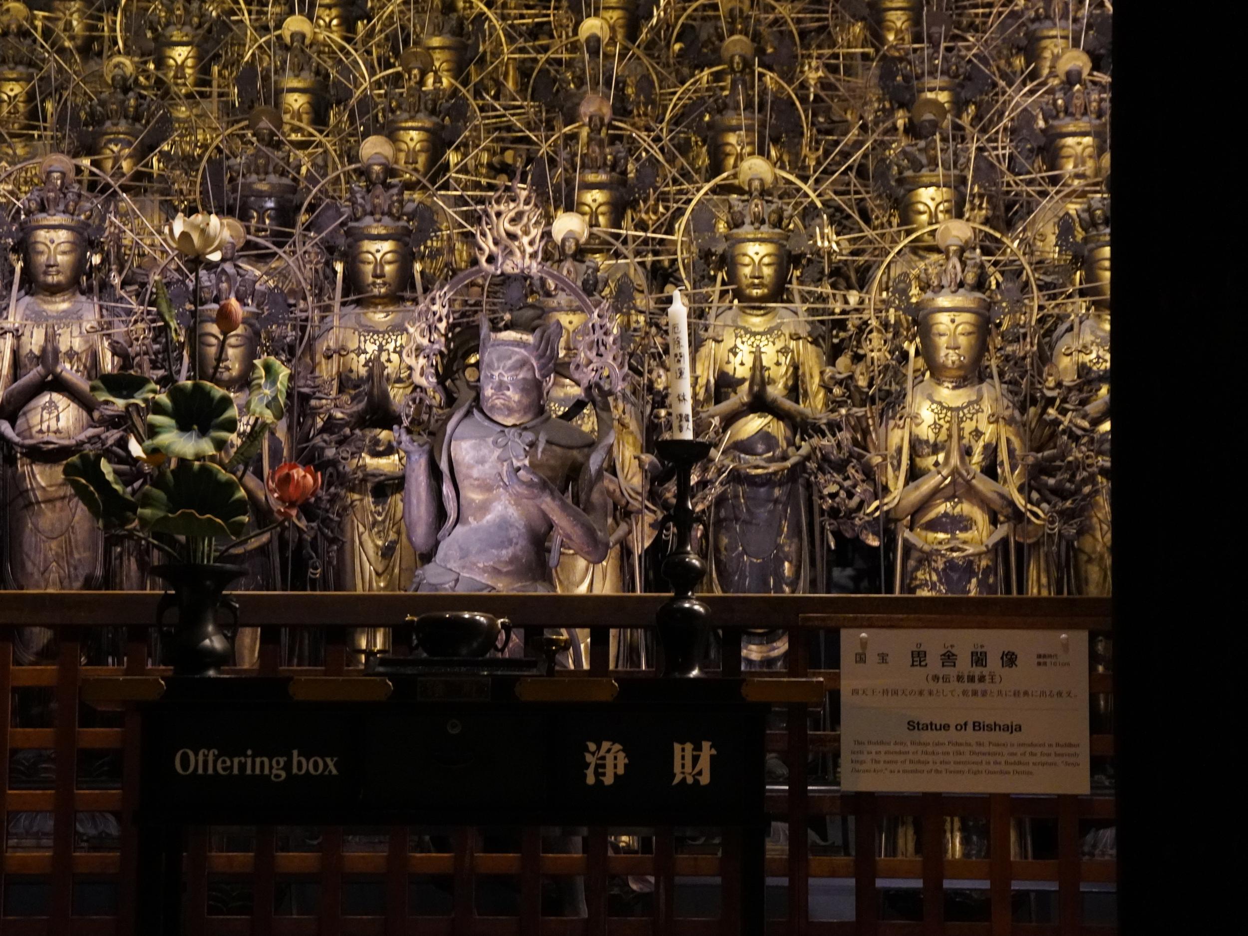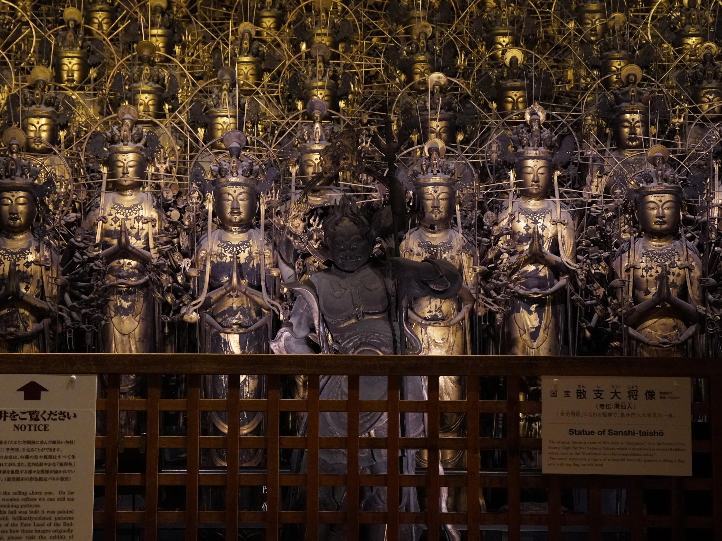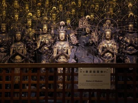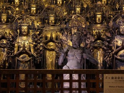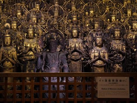 斜めに見ると一直線に並んでいる千体千手観音立像。1から1001の番号が振られており、左端(南側)最上段が1号像、左端最下段が10号像、右端最上段が991号像、右端最下段が1000号像。本尊背後に立つ夜間特別拝観で唯一見えない1001号像があります。度々火災にも運び出され、金箔に覆われたままよくぞ今に伝わったものです。