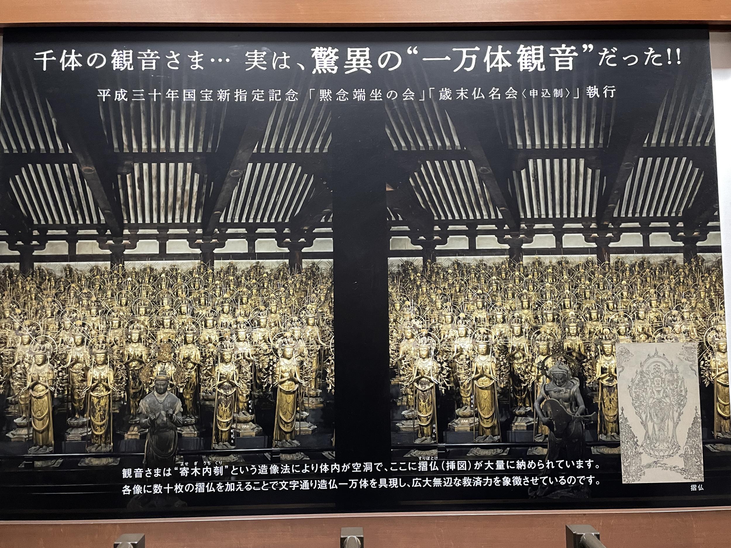 「実は驚異の"一万体観音"だった!!」というポスター、千体千手観音立像の体内には数十枚の摺仏が納められていて、一万体を具現化されているらしい。「平成の再編」のポスターで漸く本尊のお顔を見ることができました。