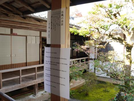方丈の撮影NGの襖絵を見学、暗い部屋と明るい部屋があってどちらも本堂同様に黒服の若い人たちが説明してくれます。狩野光信や堂本印象の障壁画のはずがあまり覚えていません。堂本印象の画風は分かるので記憶していていいはずですが思い出せない。
