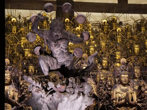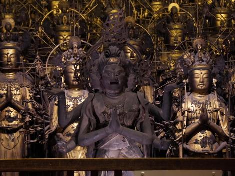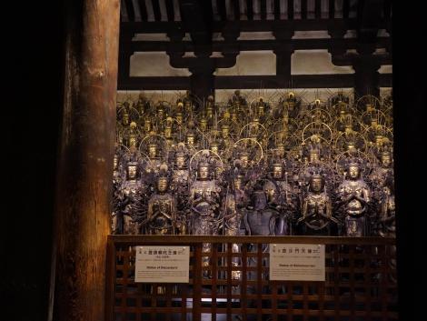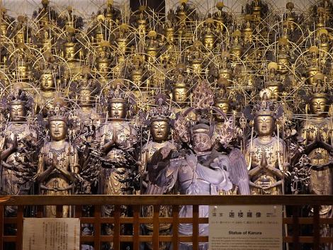 少しずつ表情が異なり装束や手に持つものも微妙に異なる千体千手観音立像のうち、124体が創建時の平安時代の像(長寛仏)、鎌倉時代の像が876体、室町時代の像が1体とのこと。78号、80号など5体は目が水晶でできた玉眼、160号、280号など長寛仏の9体や、10号、20号など湛慶作の9体は最前列とのこと。そこまでとても観察できなかったので、次の機会を待つことになります。