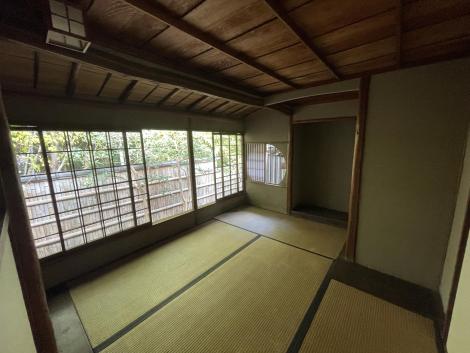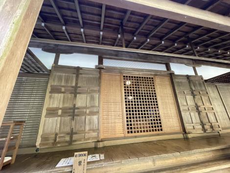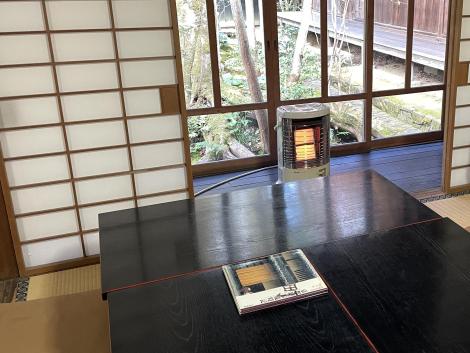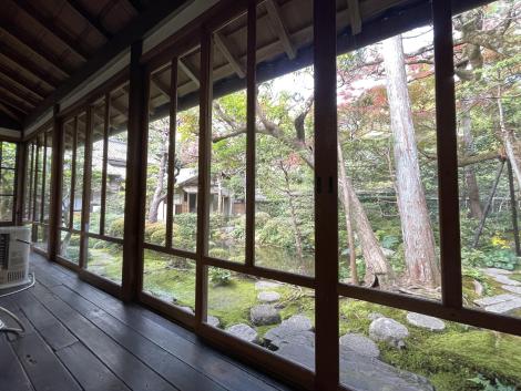 休憩室の障子を開けて腰を下ろしお茶をいただきながらお庭を眺めています。実家にあった座敷縁側のガラス障子がこんな感じでした。