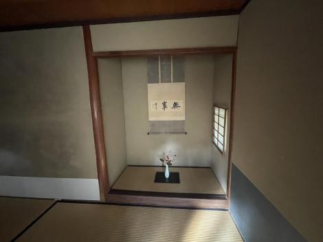 茶室「如意庵」と案内の先に二間の茶室、どっちが如意庵なのか、両方如意庵なのかは不明ですが、ひとつはガラス障子、もうひとつは紙の障子。