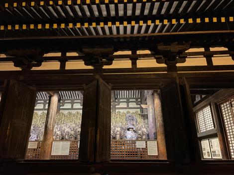 周りの人たちの万博はああだった、こうだったとかを聞きながら列が進み、6時50分、ようやく2,000円を払って境内に入れました。三十三間堂創建以来初の試みの夜間特別拝観。ブラタモリで紹介され、公開の要望が多く寄せられたことがきっかけらしい。