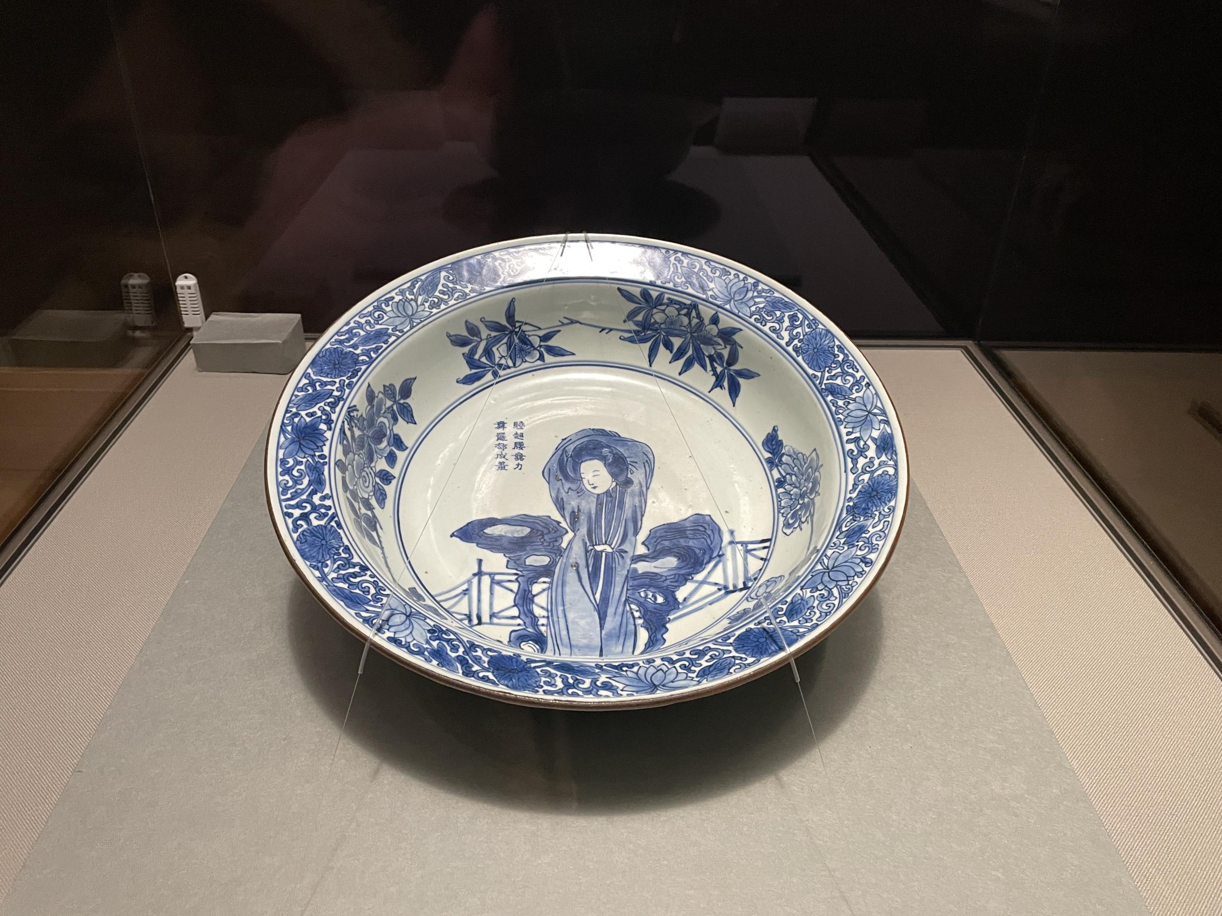 個人蔵の美人画は撮影NG。青花睡起図洗(景徳鎮窯、清時代・18-19世紀)、皿の詩文は「睡起腰無力 舞罷却成羞」、意味は「眠りから覚めると腰に力が入らず、舞い終えると、かえって恥じらいを見せた」、中国の古詩に見られる「美人の婉然たる姿」を描写する定型的な表現だそうです。