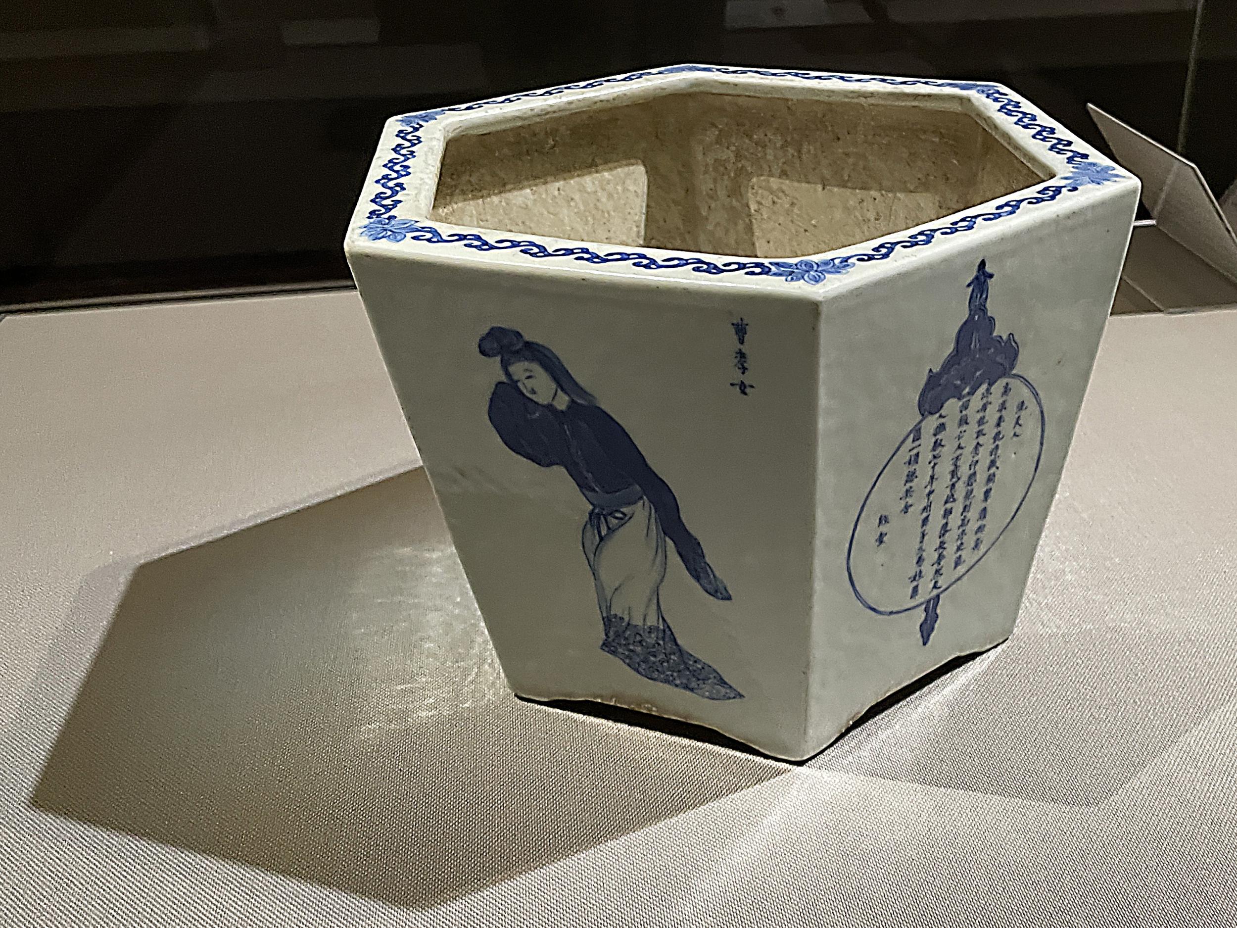 青花人物図六角植木鉢(景徳鎮窯、清時代・19世紀)、描かれた女性は、元代の親孝行教訓書「二十四孝」に登場する曹孝女。病の父のために自分の長く美しい髪を売り薬代にあて、父は回復したそうな。