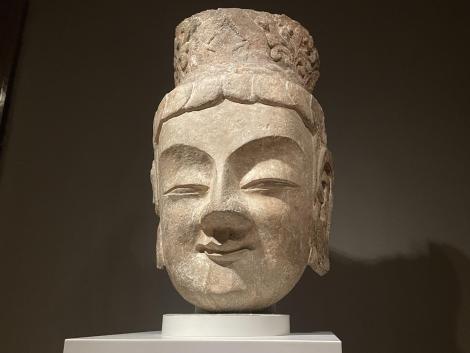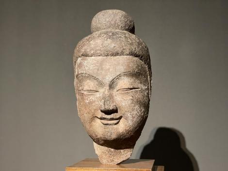 微妙に異なるアルカイックスマイルを浮かべた菩薩立像頭部(北魏、6世紀前半、龍門石窟賓陽中洞将来)、如来立像頭部(北魏、5世紀後半、伝雲岡石窟将来)、如来像頭部(北魏、5-6世紀、雲崗石窟か)。