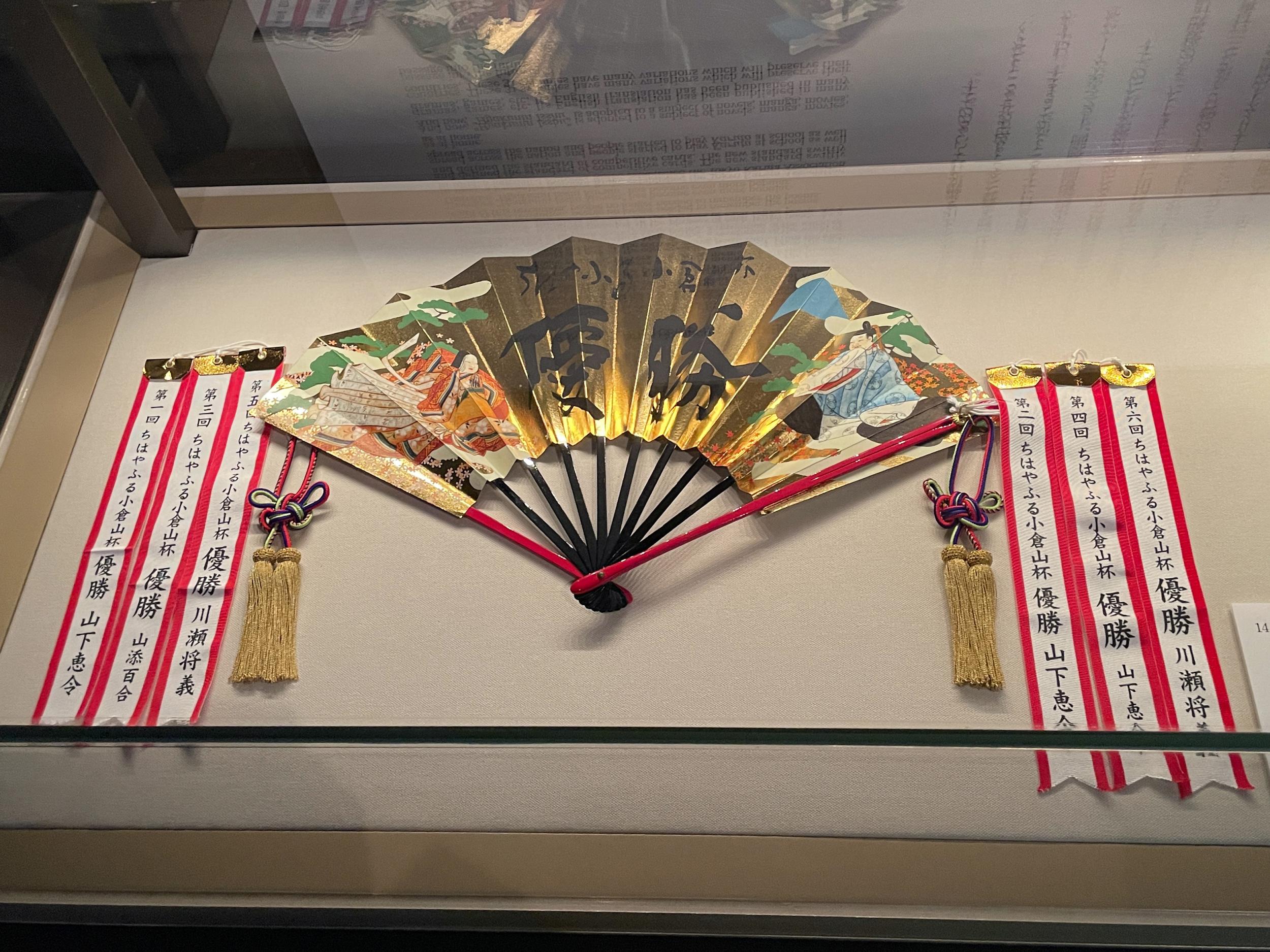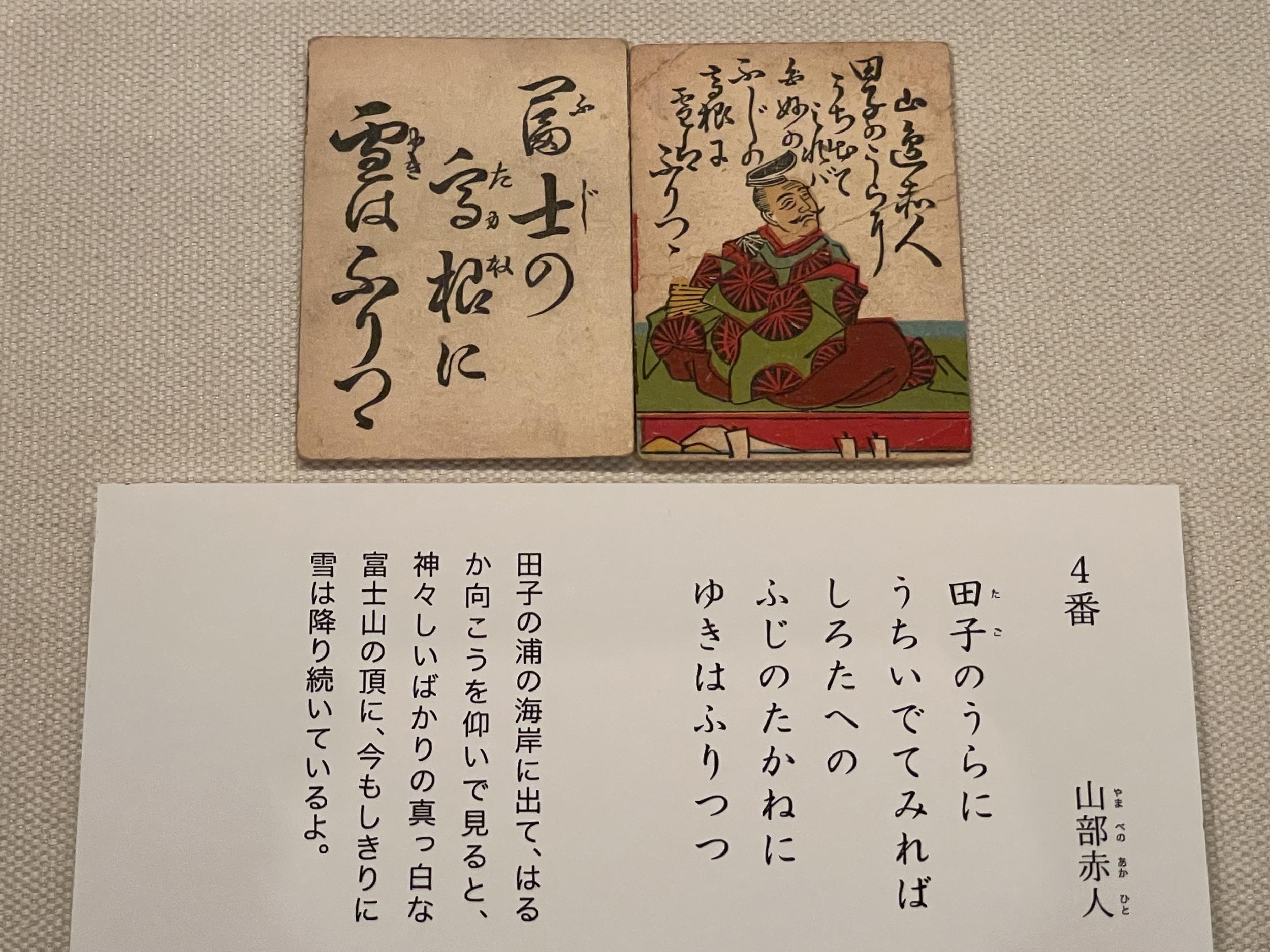 常設展の「百人一首ヒストリー」。紅葉百人一首姫鑑(ひめかがみ、文化10年、1813年)は女性のための指南書、周りは17~19世紀の百人一首97番権中納言定家の札ばかりが並べられています。