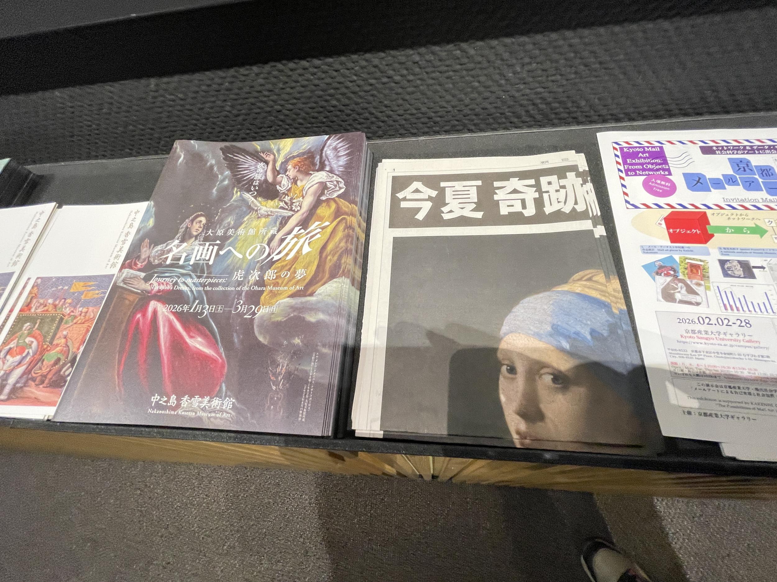 「今夏奇跡の来日」の朝日新聞号外が置かれていました。フェルメール「真珠の耳飾りの少女」が8月21日から9月27日まで大阪中之島美術館での展示決定の速報です。日本ではたぶんダ・ヴィンチのモナリザより人気の作品、大混雑は必至もぜひ見てみたい。フェルメールの他の作品も集められるのか、同時代のレンブラントらの作品もやってくるのか、どういう展覧会になるか楽しみです。会場はここ中之島香雪美術館ではなくて収容力のある大阪中之島美術館です。