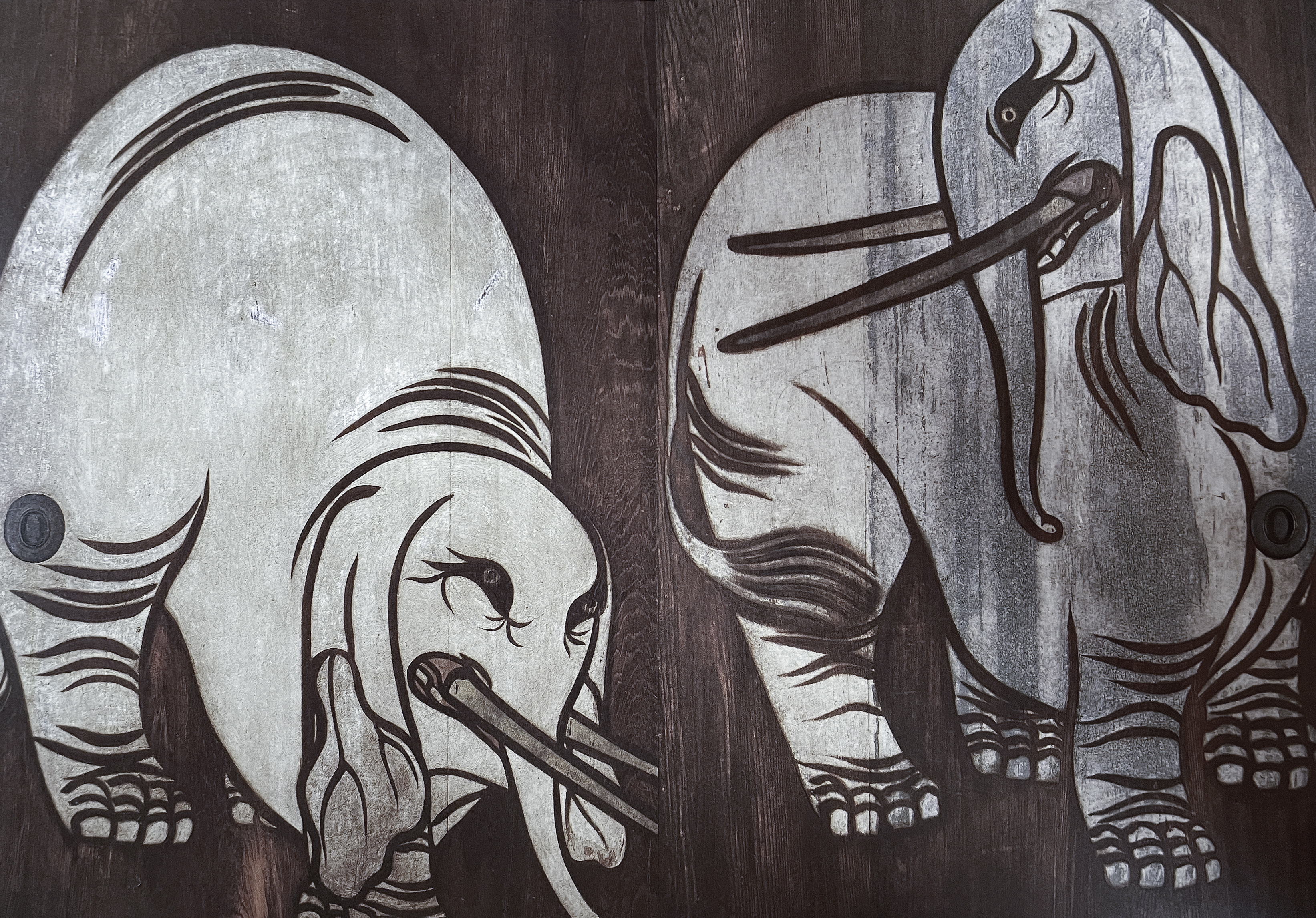 血天井の廊下のつきあたりに白象図。絵葉書では全体が杉板の茶色のモノトーンに見えますが、実際にはモノクロに近い色合いで、これくらいの感じです。絵葉書は左右別々に1枚ずつになっていて、並べると襖の引き手がズレてしまっていたので、絵葉書をずらして撮り直しトリミングしています。