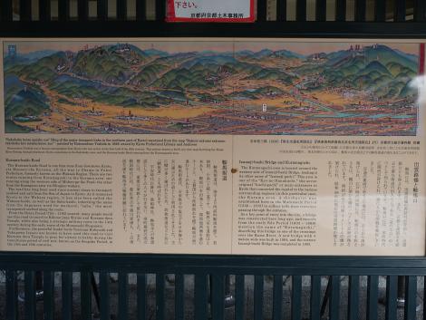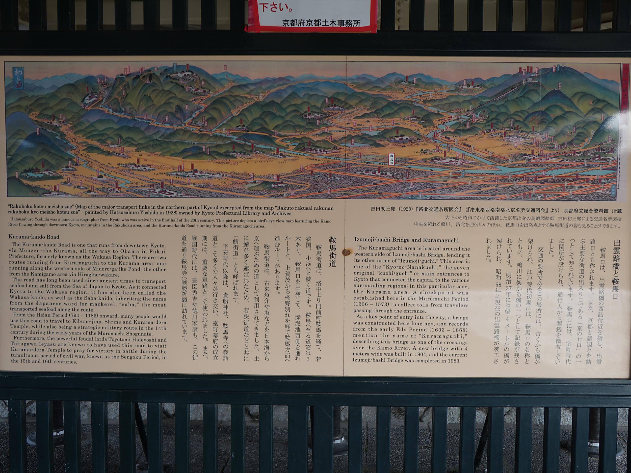 出雲路橋の下に掲げられた洛東洛西洛南洛北京名所交通図会、出町柳から高野川を遡って大原がほど近く、左へずんずんと鞍馬山と貴船までの道が描かれています。