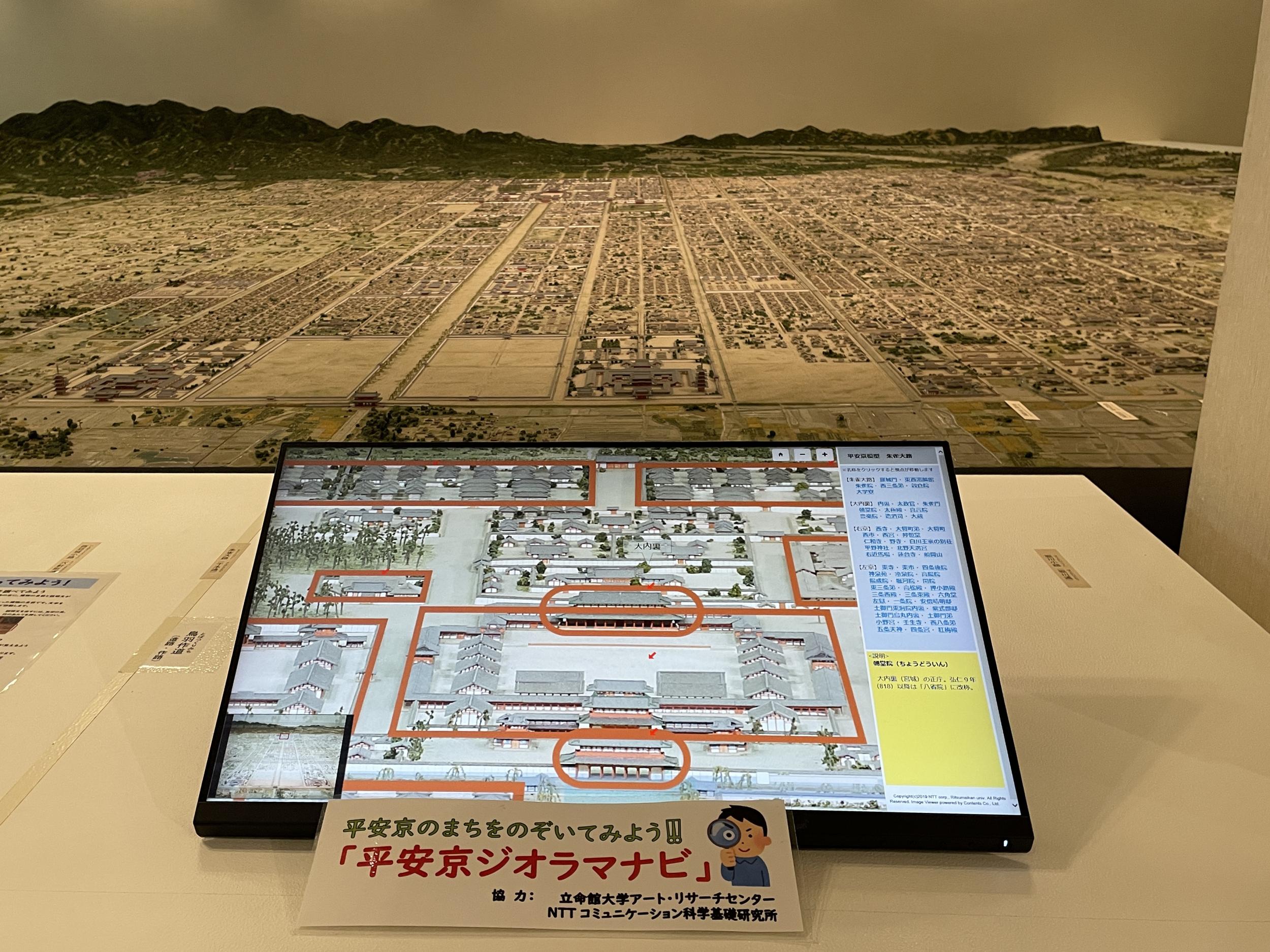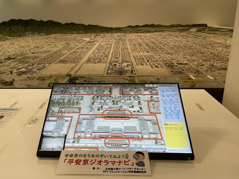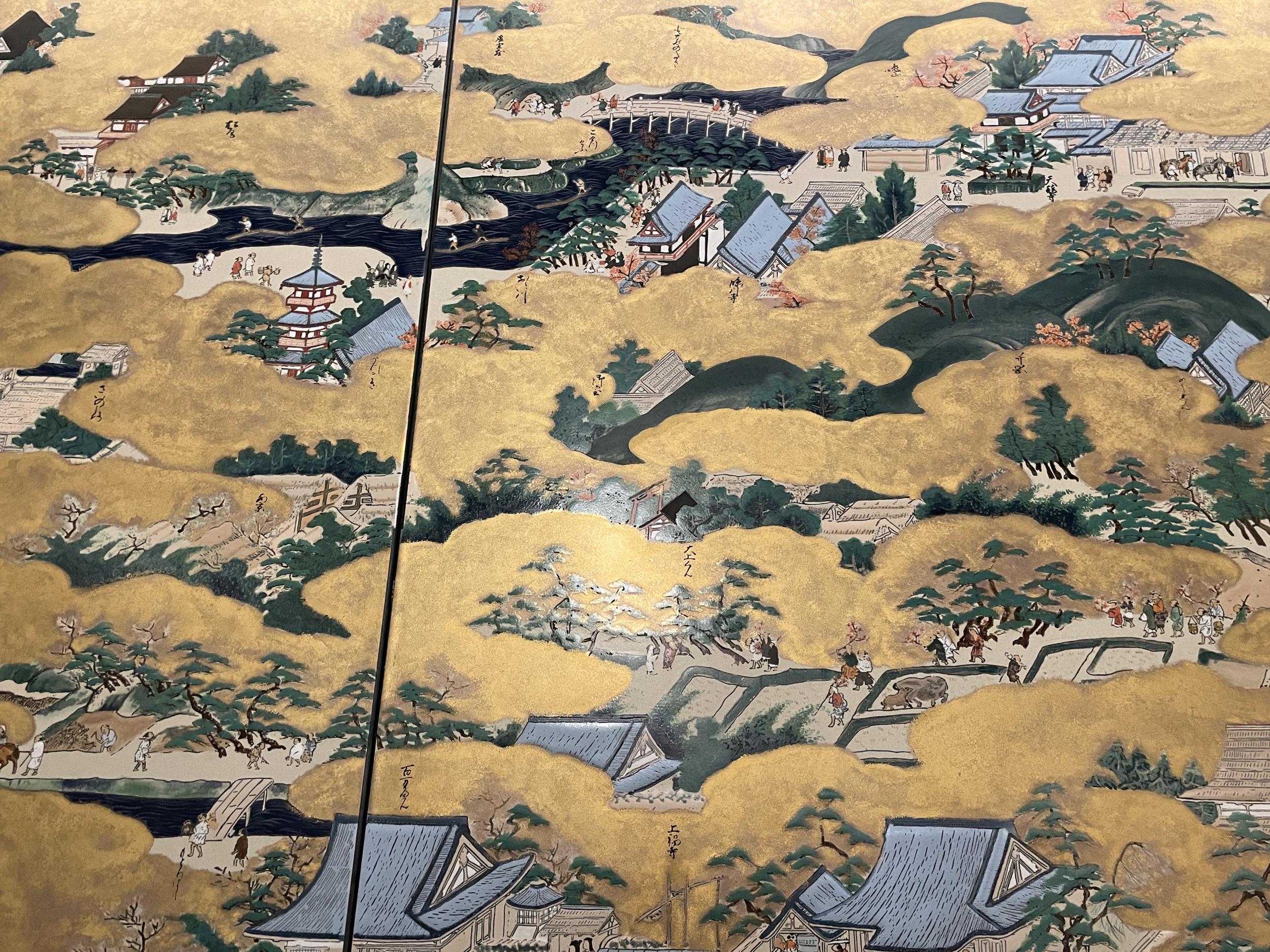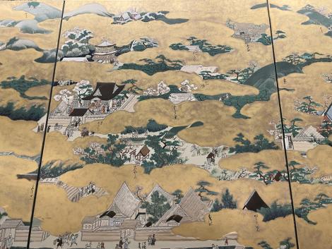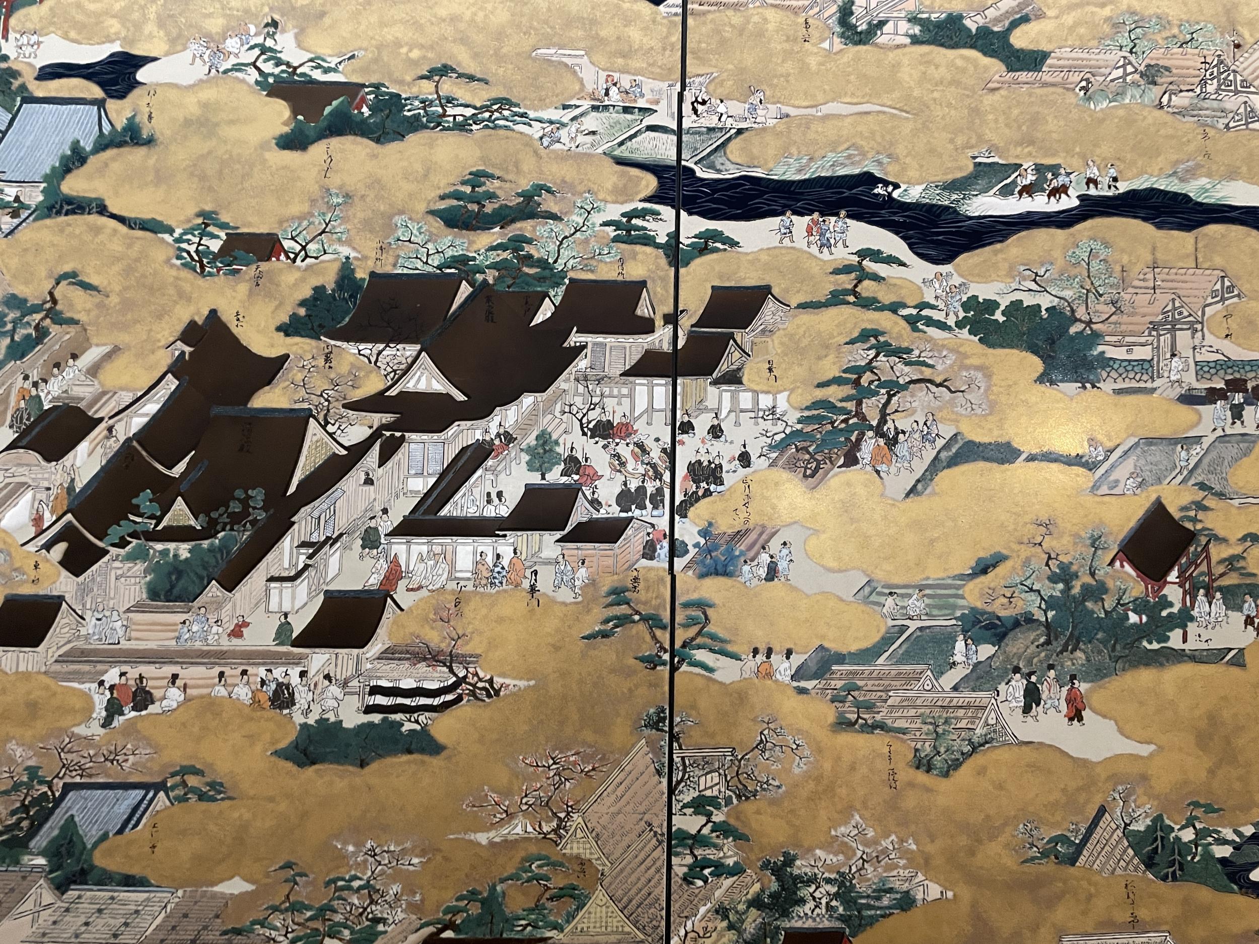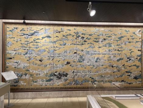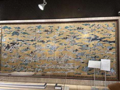 法勝寺の九重塔のジオラマの向こうに洛中洛外図屏風、上杉本洛中洛外図屏風と呼ばれ、天正2年に織田信長が狩野永徳に描かせ上杉謙信に贈られ、原本は山形県米沢市の上杉博物館所蔵され国宝。この複製は屏風ではなく陶板壁画です。