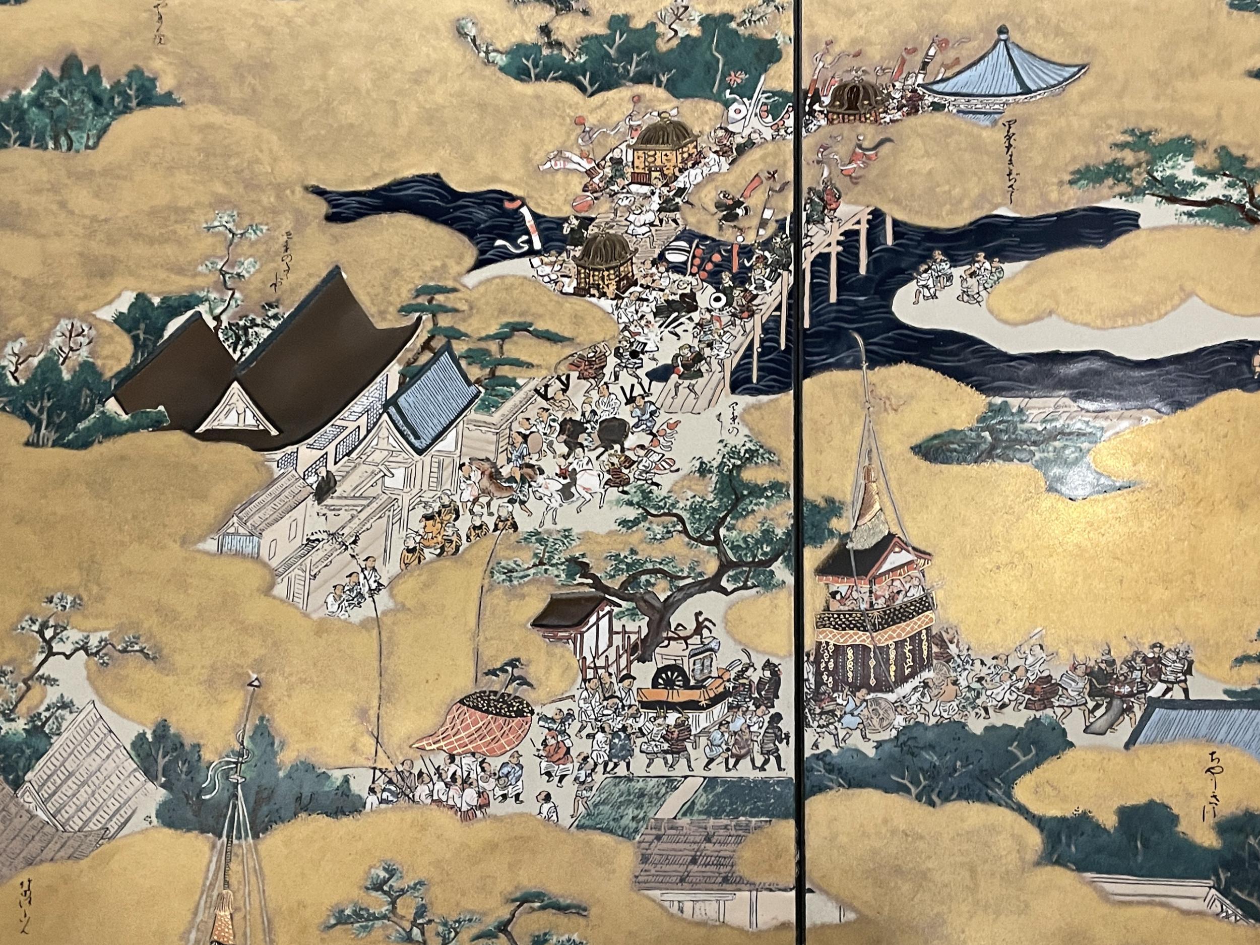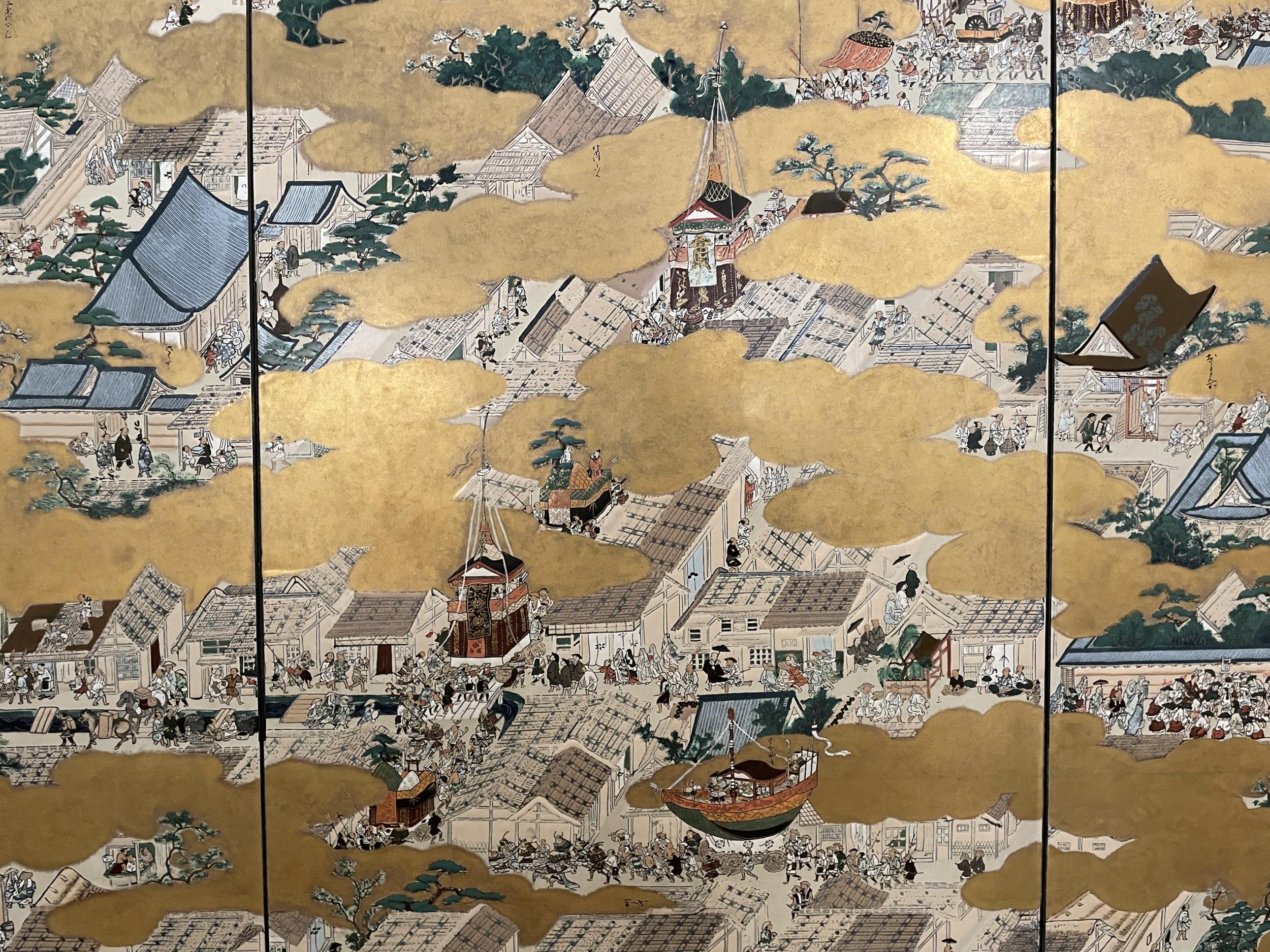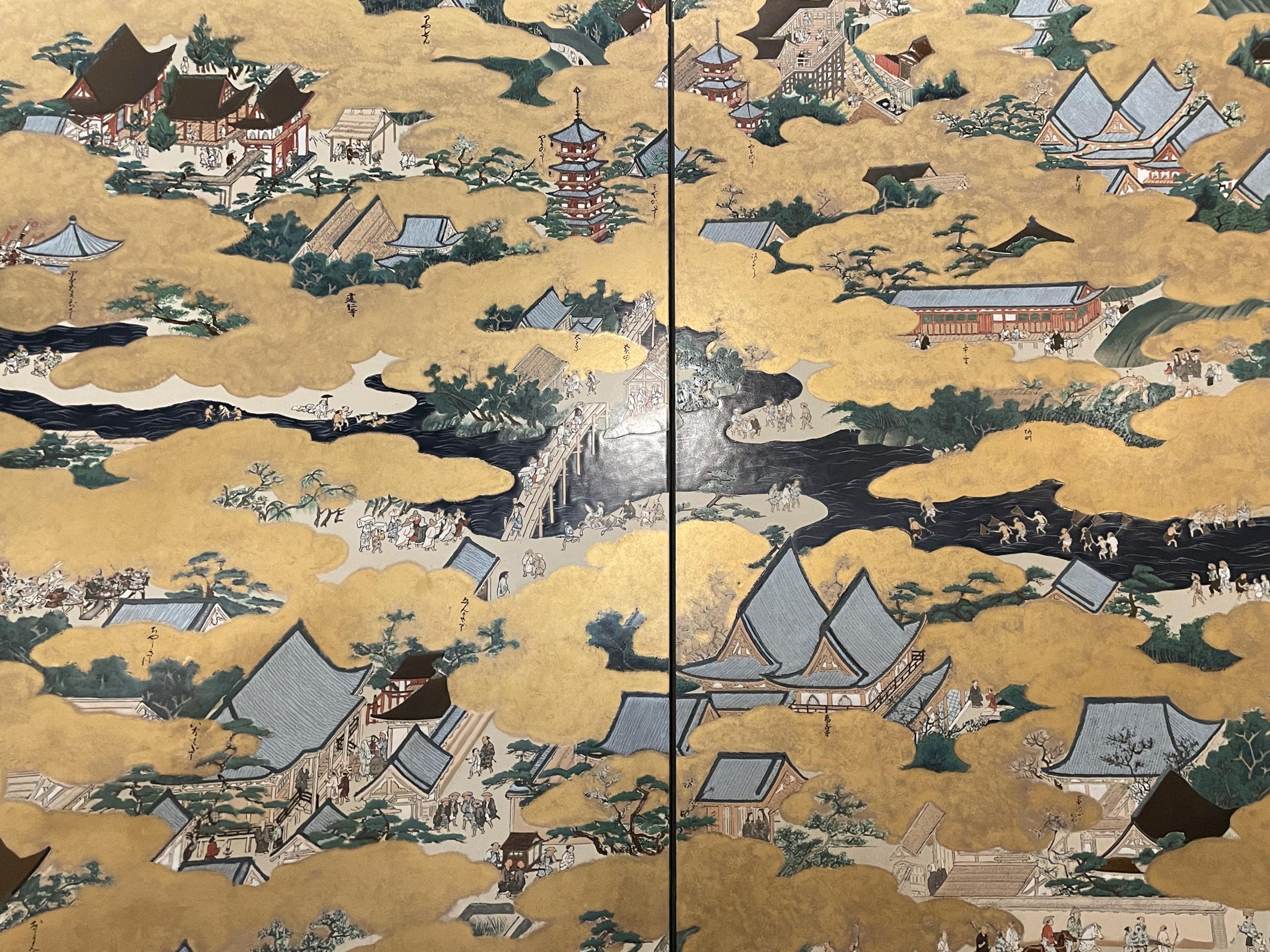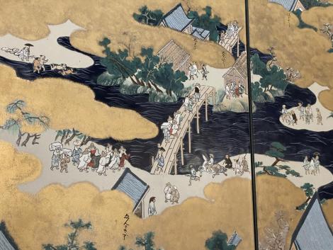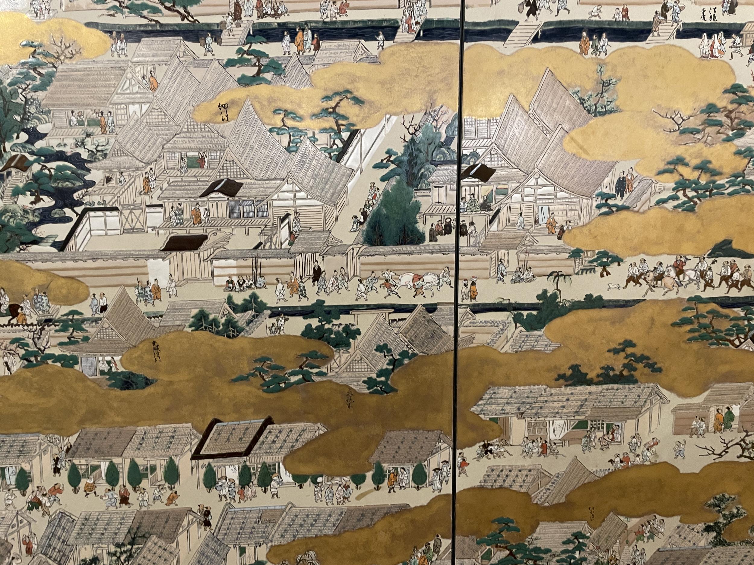 法勝寺の九重塔のジオラマの向こうに洛中洛外図屏風、上杉本洛中洛外図屏風と呼ばれ、天正2年に織田信長が狩野永徳に描かせ上杉謙信に贈られ、原本は山形県米沢市の上杉博物館所蔵され国宝。この複製は屏風ではなく陶板壁画です。