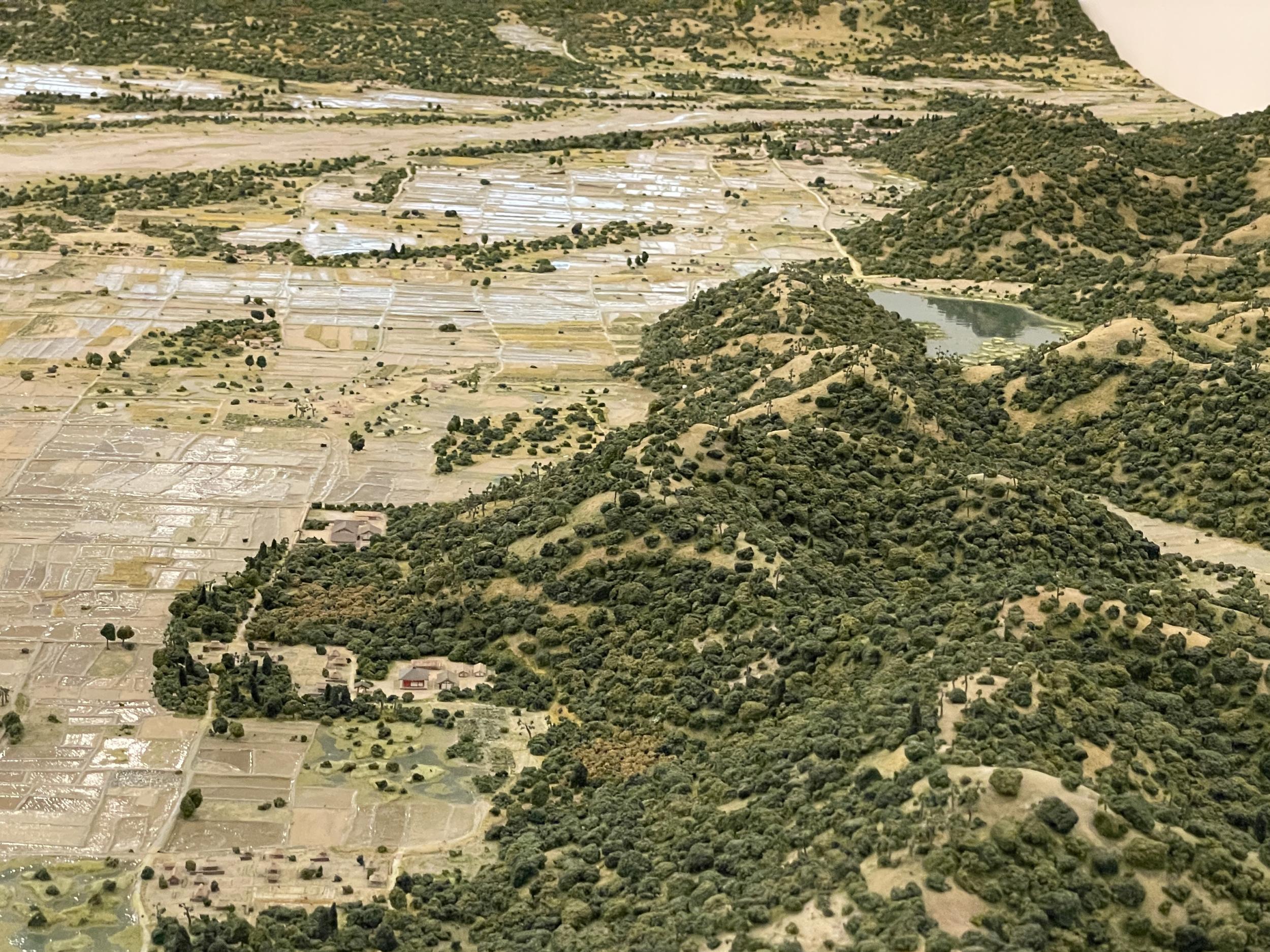 大河ドラマのオープニングにも登場した平安京特大ジオラマ、その時の大河ドラマは見てません。右奥へ回り込むと森の中の深泥池、太古の昔から存在する池です。北山付近は田んぼばかり、画面左上の木々多い辺りは現府立植物園。