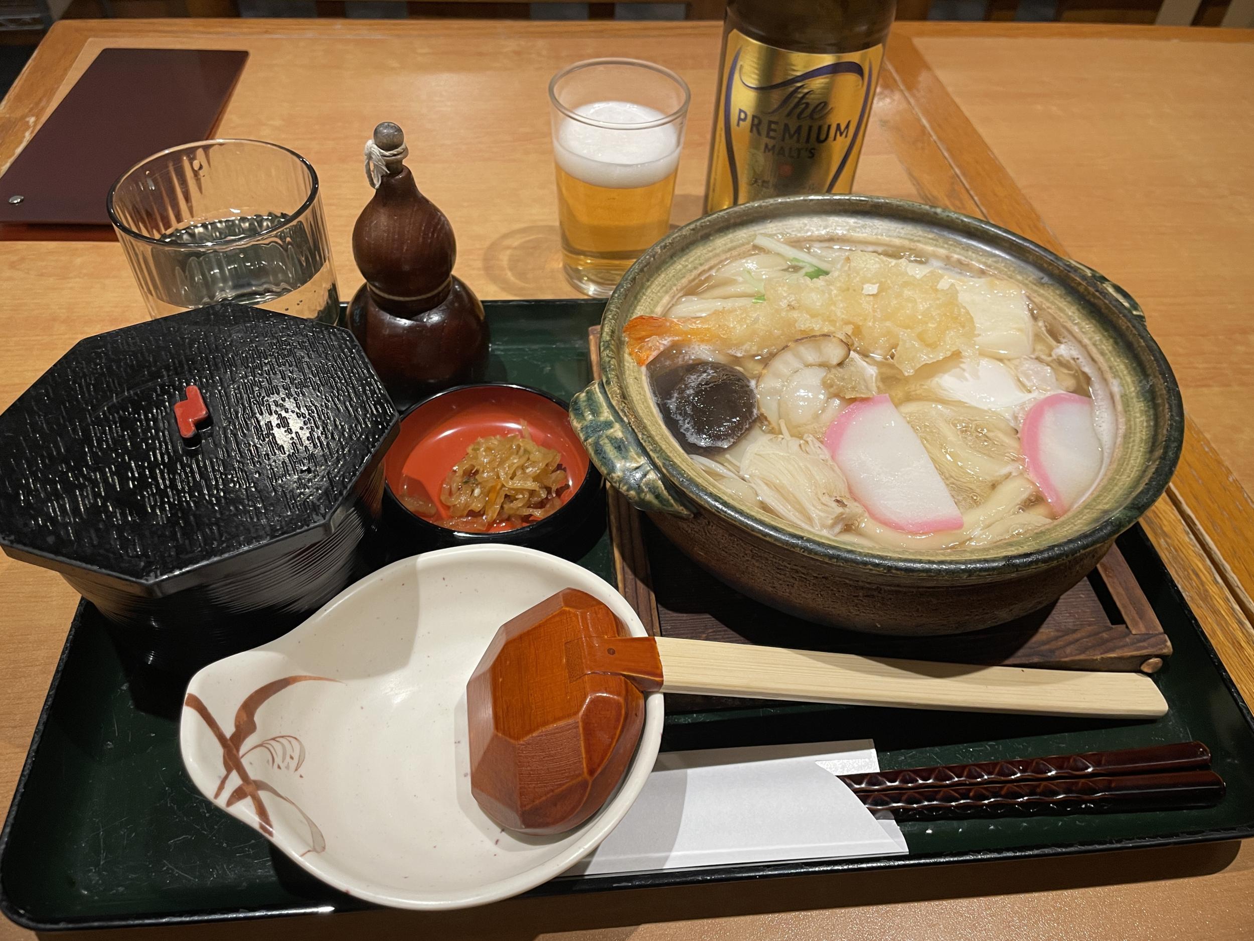 天満橋でもこれといったお店は見つけられず結局上本町まで戻ってきました。よく行くお店でこの顔を披露するのは恥ずかしいので、あまり行かないお店で鍋焼きうどん、2日間止めておいたアルコールですが、プレモルで試運転。傷の残るくちびるに苦手なお餅が入っていて難儀しました。