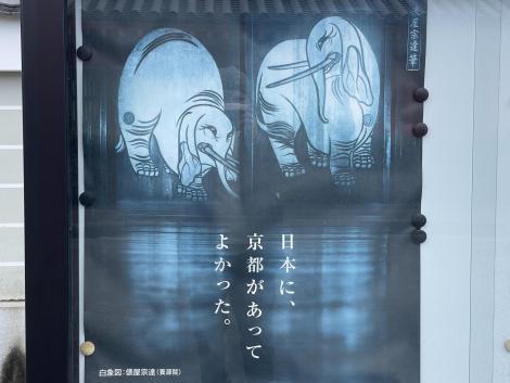 三十三間堂を越えて右へ曲がると白象図のポスター。日本に、京都があってよかったは京都市のPRポスターで2008年の第1段渡月橋から始まり、2020年の題34段京セラ美術館までで止まっているようです。白蔵図は2014年の第23段。