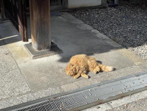 杉戸絵の他、本堂牡丹の間で狩野山楽筆紙本金地著色牡丹図の襖絵を見たのですが、絵葉書にセットに含まれていたのは見た記憶のない俵屋宗達筆金地着色松図、どうやら通常非公開らしいと分かりました。実際に見ていない絵を絵葉書で紹介するのは憚られるので控えておきます。ところどころカーペットが敷かれているものの、ずっと板の間で説明を聞いていたので足が冷たいのですが、帰りがけにホットカーペットになってなくてスミマセンとの一言で心は暖かくなりました。養源院参道のニャンコたち、ネコのいる寺としても知られているらしい。