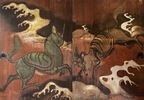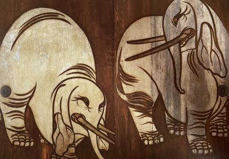 小説では少年俵屋宗達が織田信長の御前で描いた白象図ですが、養源院では元和7年(1621年)頃に描かれたものと紹介されていました。生没年不詳の俵屋宗達だけに、小説の作者のこの想像の膨らませ方はアリです。唐獅子図や麒麟図と較べると白象図は筆致がシンプルで、子どもが描いた絵のような楽しさがあり、母象に甘える子象の様子に宗達の母への思いが描かれているようにも感じられます。