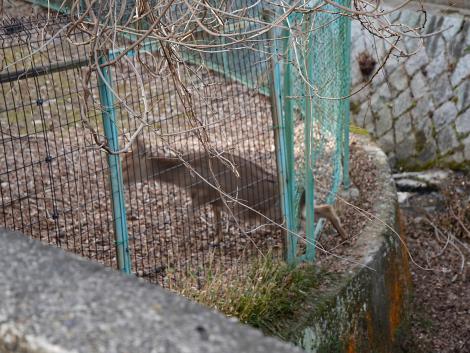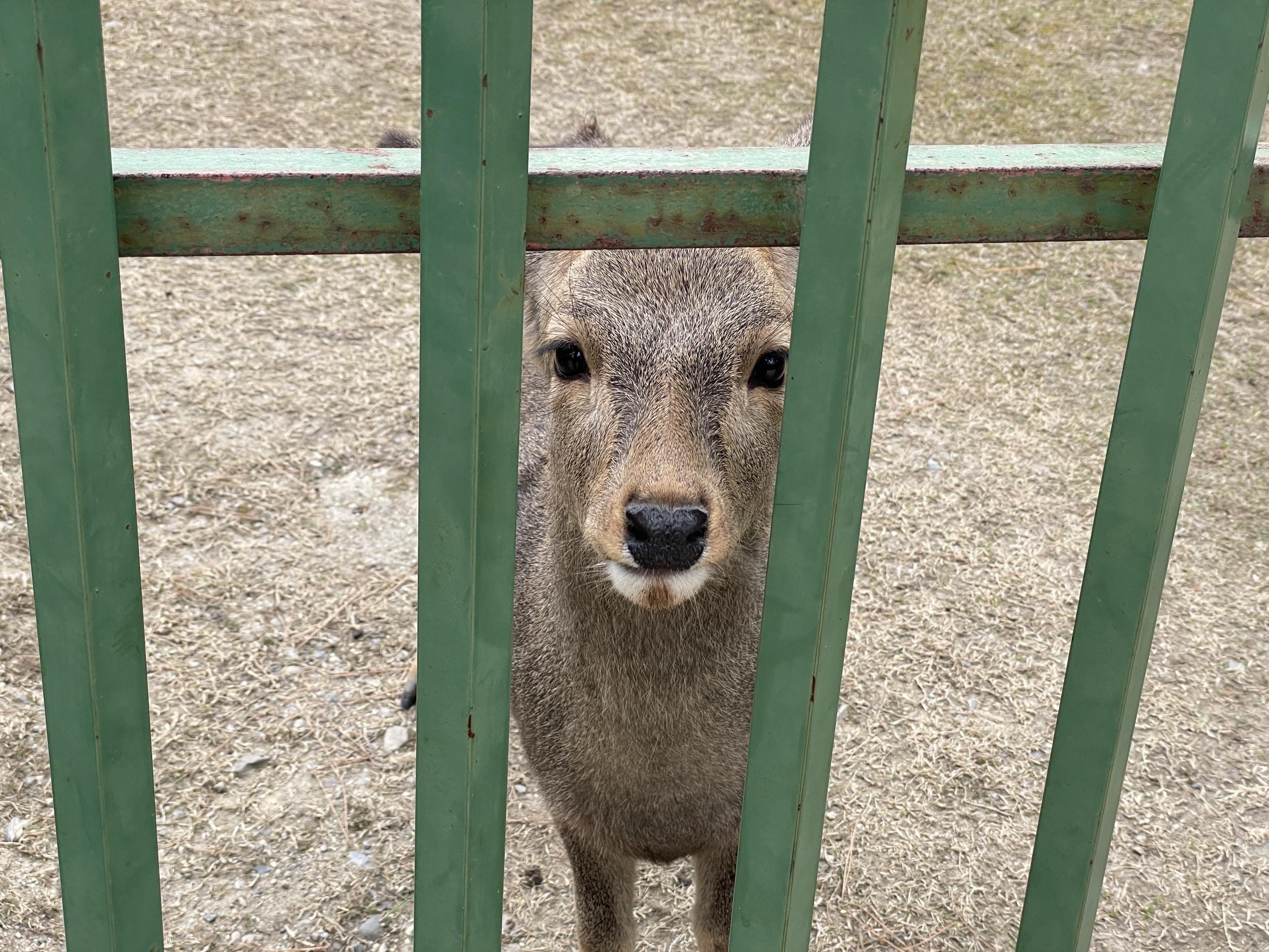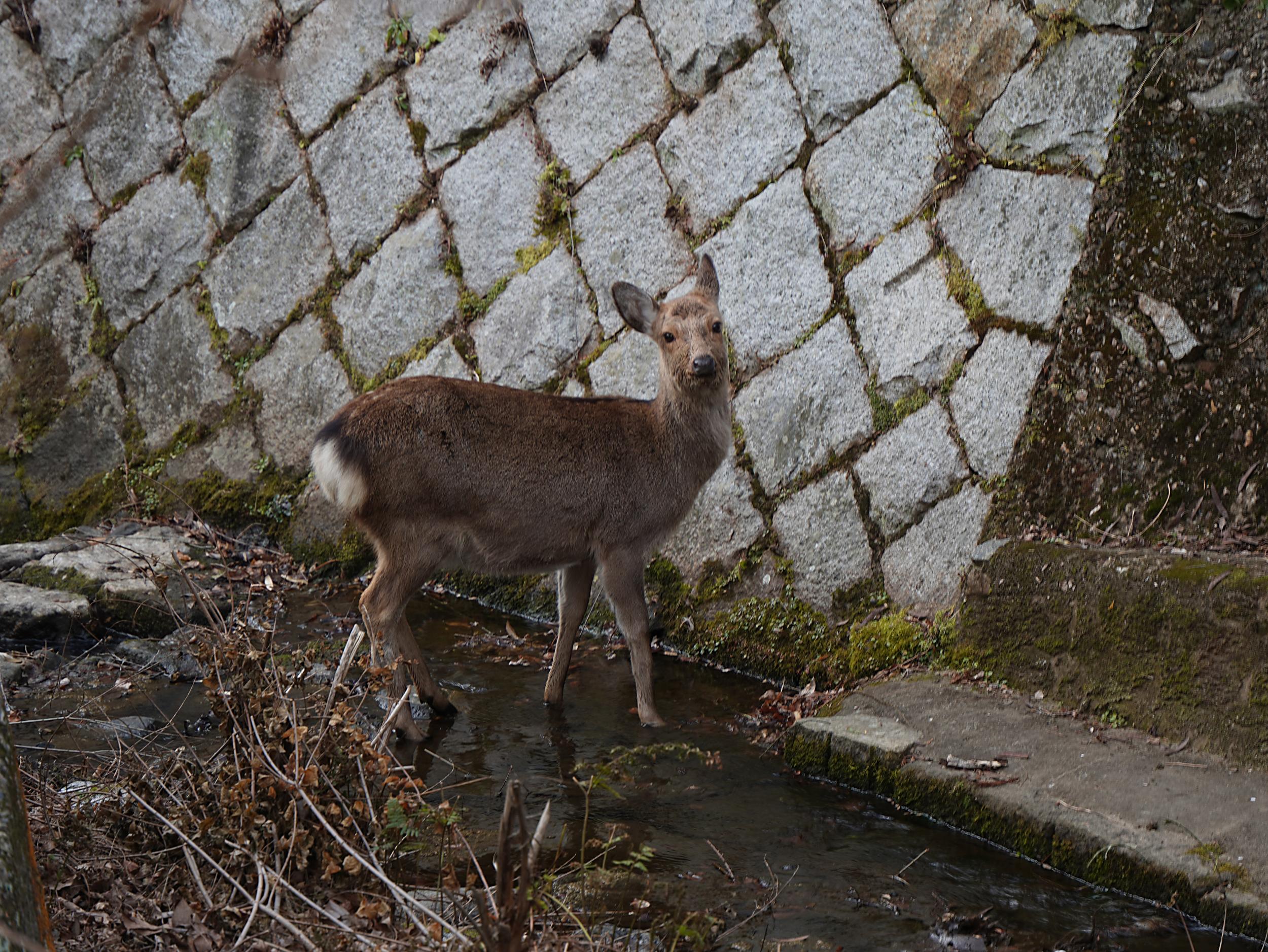 水門町の片側だけ欄干の残った「うみすゐもん」の橋が架かる吉城川支流の白蛇川にシカ、どうやって出るのか見ていると、川の石垣に上り、金網の破れたところをくぐって行きました。