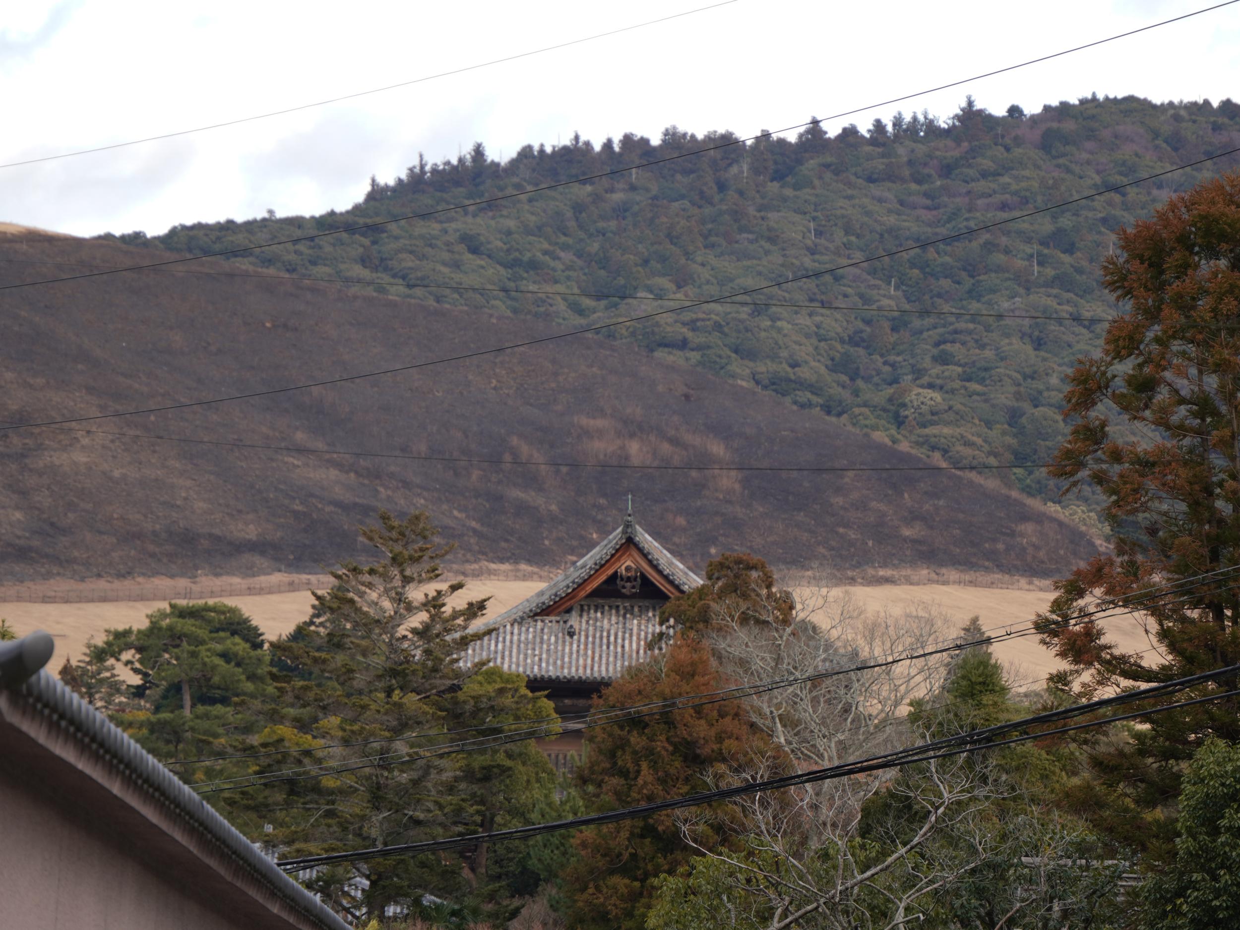 山焼きが終わったばかりの黒い若草山、手前は8.4m運慶快慶作金剛力士像のある南大門です。