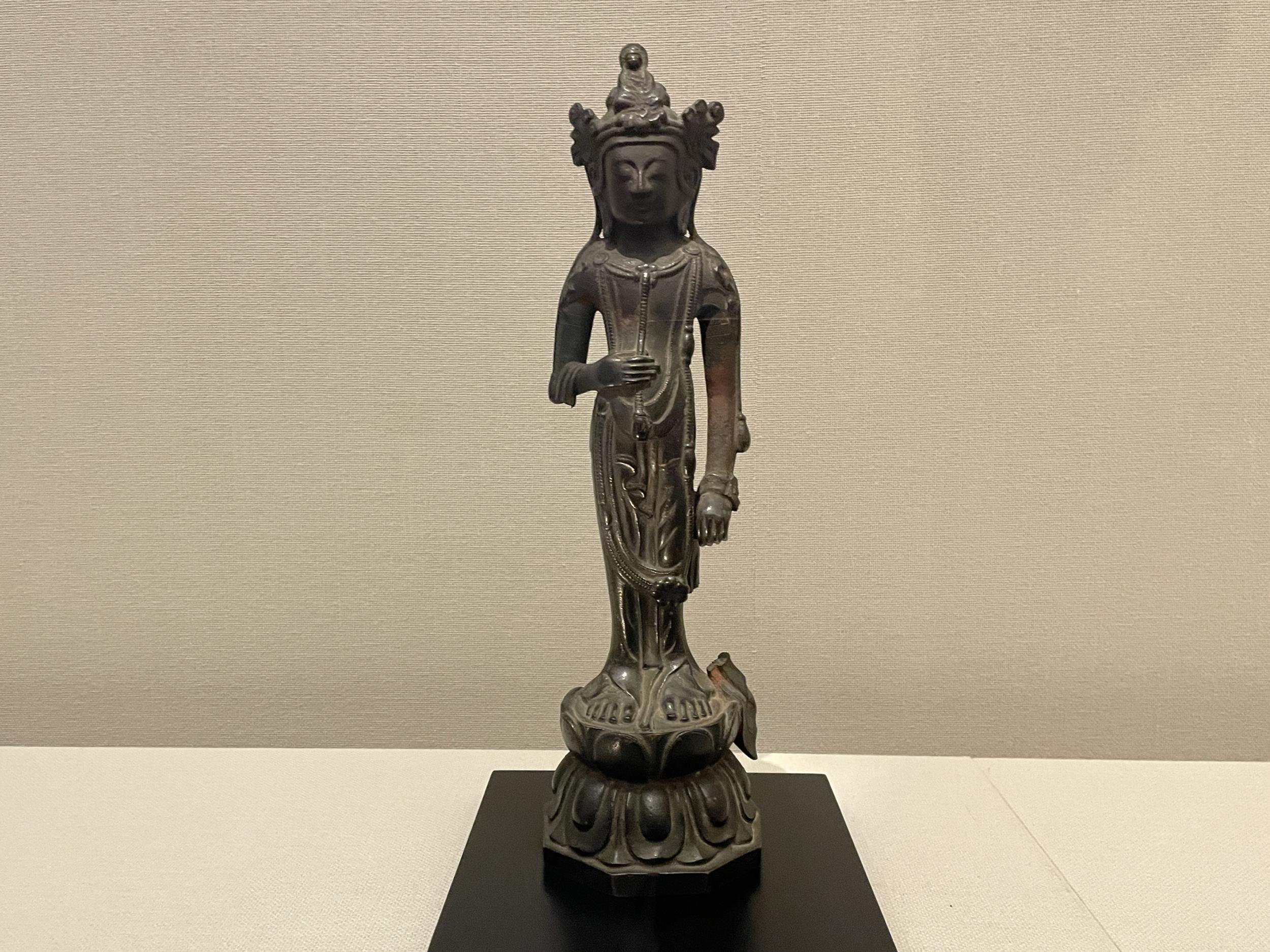 観音菩薩立像(飛鳥時代-7世紀)は頭上に天冠化仏、香川県三豊市伊舎那院伝来らしい。東博にそっくりな法隆寺宝物の観音菩薩立像を見つけました。同型あるいは同系統の原型で鋳造され、ヤマトの技術が地方にも伝えられていたことが分かります。