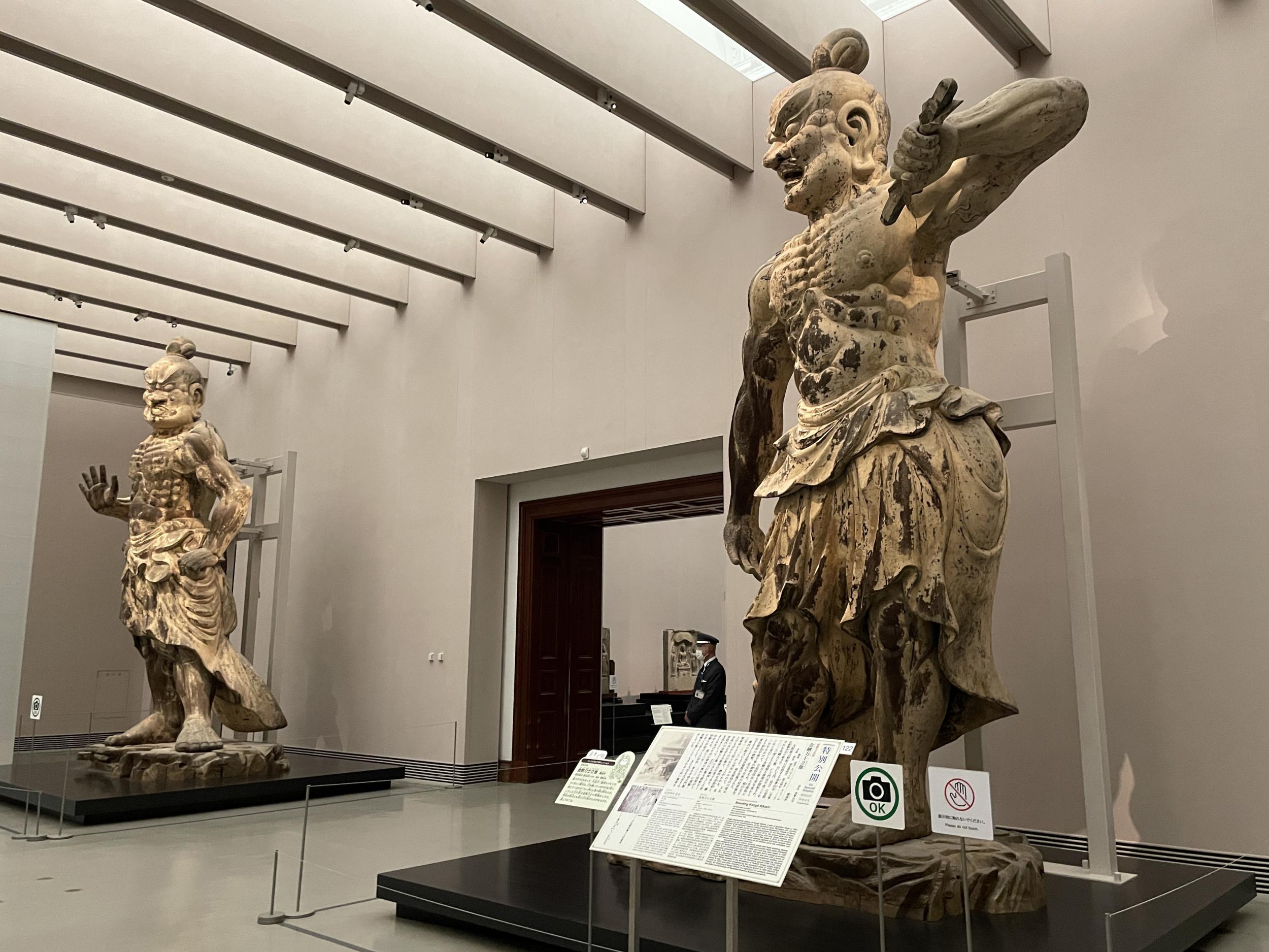 金峯山寺仁王門の金剛力士立像(延元4年-1339年、南都大仏師康成作)、特別展示ですが、2018年から始まった吉野の金峯山寺仁王門大修理が完了予定の2028年までの特別展示らしい。左奥阿形は口を閉じていて右手前の吽形は口を開いていることを確認。8.4mの東大寺南大門金剛力士像に較べると小さいものの、向こう側に立っている警備員さんとの比較で大きさがよく分かります。大きさも躍動感のひとつと言えそうですが、大きすぎてリアルさは感じさせません。