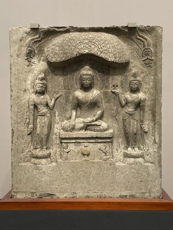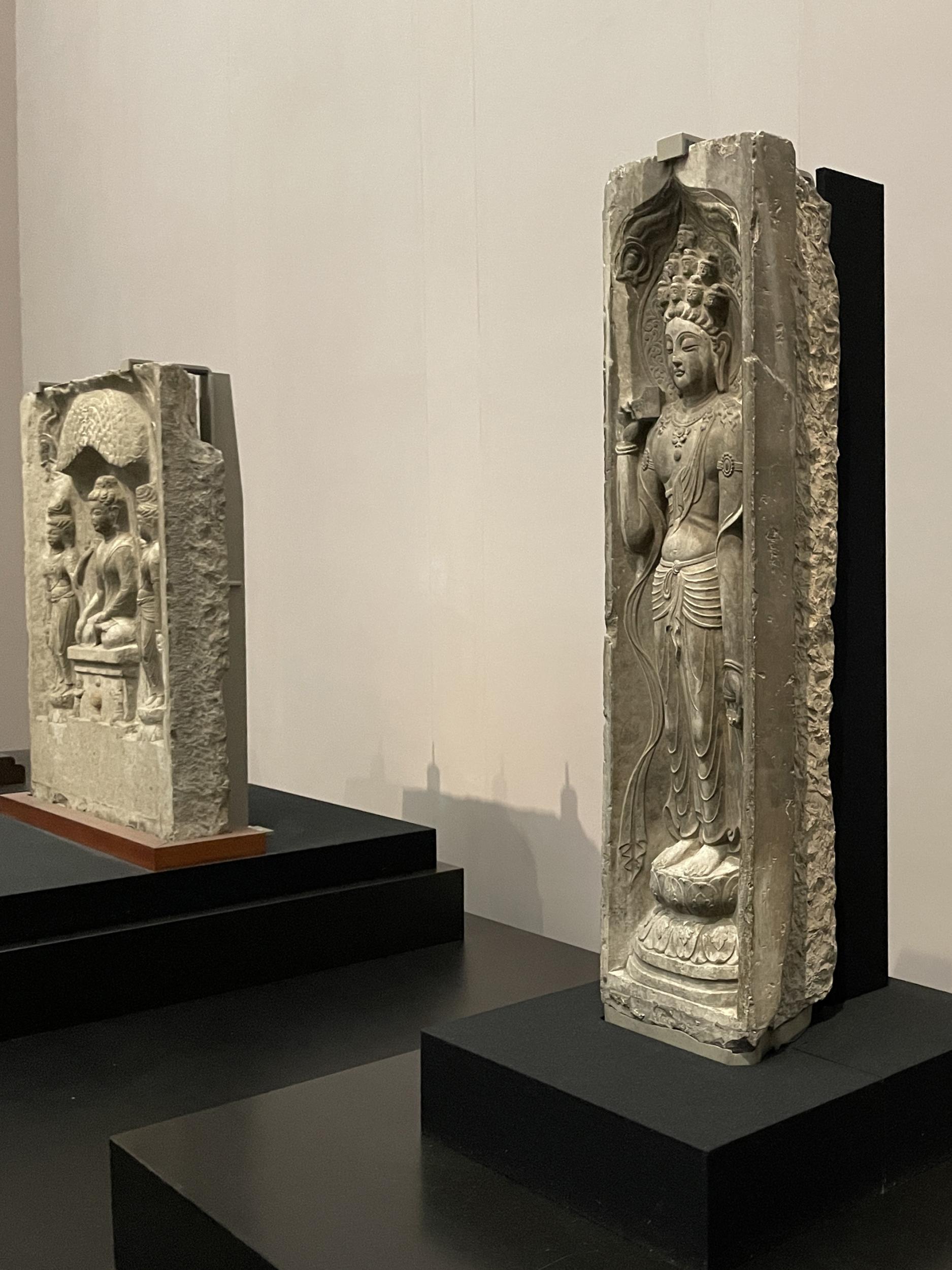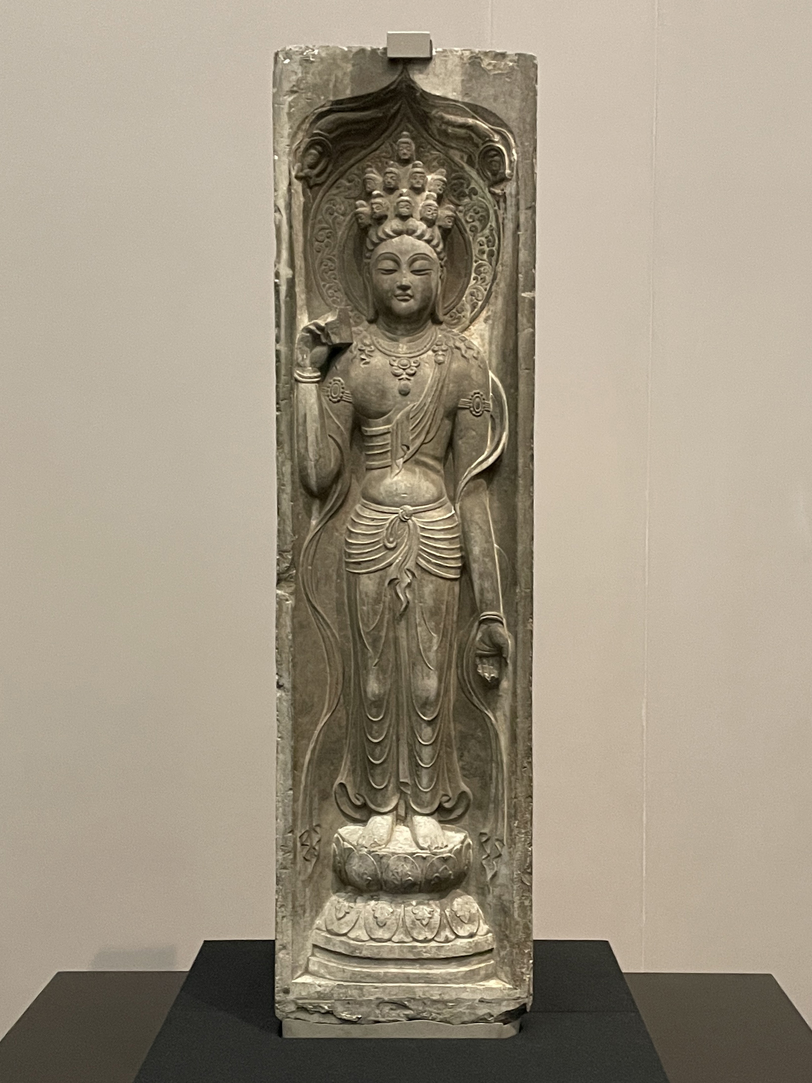 優しい表情、くびれた腰、長い手で女性を強く感じさせる十一面観音菩薩立像と如来三尊像(いずれも長安3〜4年-703〜704年)、中国史上唯一の女帝、則天武后が唐に代わり建てた15年間の武周朝時代の造立と考えられています。いずれも陝西省西安市宝慶寺伝来、西安は唐の都長安、その光宅寺という則天武后が建てた寺院にあった七宝華台という塔の外壁にはめ込まれていた石灰岩浮彫の石仏とする説が有力で、光宅寺荒廃後に、近世まで塔が存在していたことを示す記録が残る宝慶寺に移されたと考えられるようです。清朝崩壊頃の中国の混乱期に明治末から昭和初期に、おそらく美術商の早崎稉吉により買い付けたもので、ここ奈良博の他、東博やボストン美術館等にも所蔵されています。