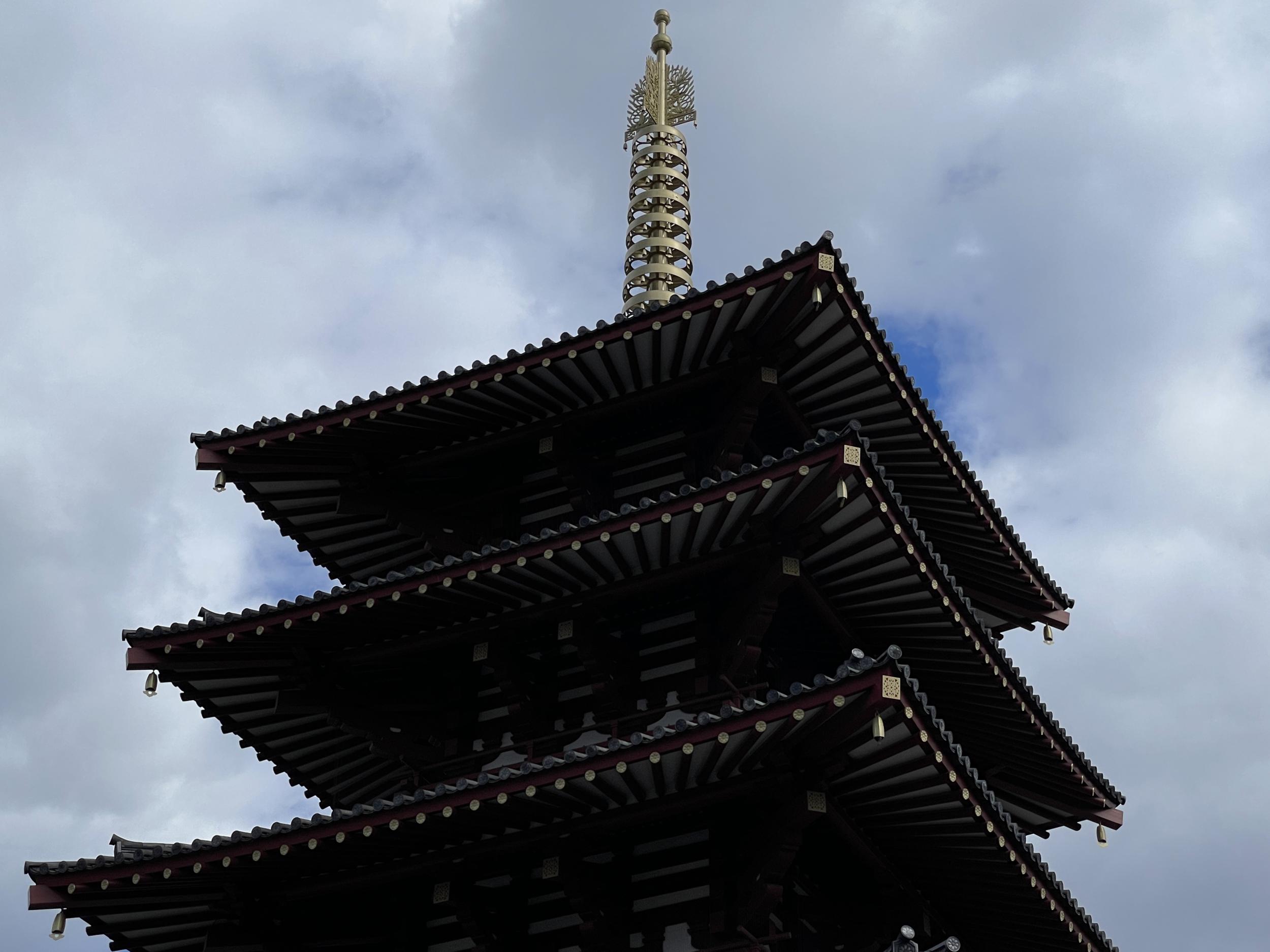 五重塔です。11年も前に初めて20倍ズームのカメラを買った時に、この五重塔の九輪の先の水煙が天女の舞になっていることにビックリしたことを思い出しました。見直してみると、いつの間にか九輪全体が金色に代わってます。