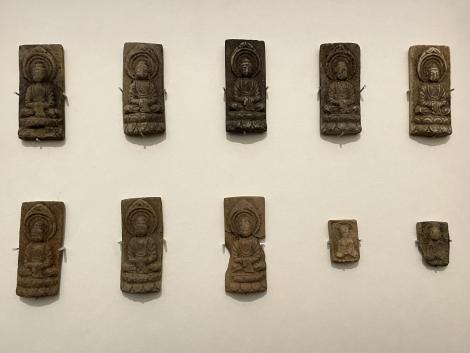 夏見廃寺出土小型独尊塼仏(飛鳥時代-7世紀)、夏見廃寺の塼仏壁は名張中央公園の夏見廃寺展示館や明日香村埋蔵文化財展示室で復元展示されています。かなりの数が出としているようで京大博物館ではさらに多数が展示されているのを見たことがあります。