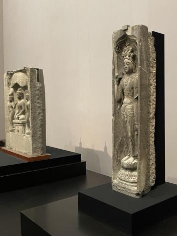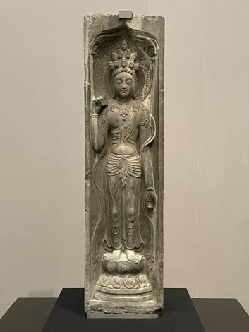 横から撮ってみると後ろに岩がくっついているので、石窟から削り取られたものかと思いきや、大阪市立美術館の天龍山石窟将来の浮彫半跏思惟像や鳳凰像と異なり、背面も直立していて切り口はストレート、もともと寺院建築内に据えられていた独立した石造仏を切り出した際に残った岩質部のようです。天龍山石窟のように現地遺構の破壊が確認できる事例とは異なり、当時すでに廃絶していた寺院跡から持ち出された可能性が高く、天龍山石窟とは異なり、中国からの返還要求も確認されていません。