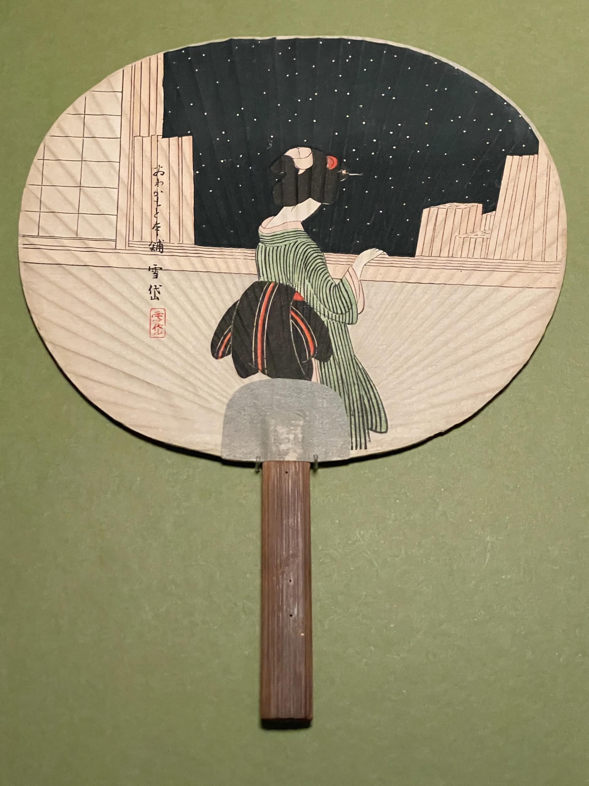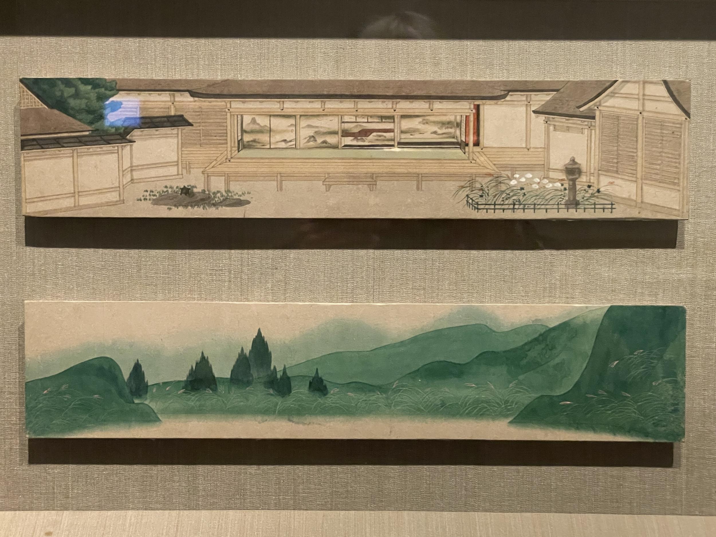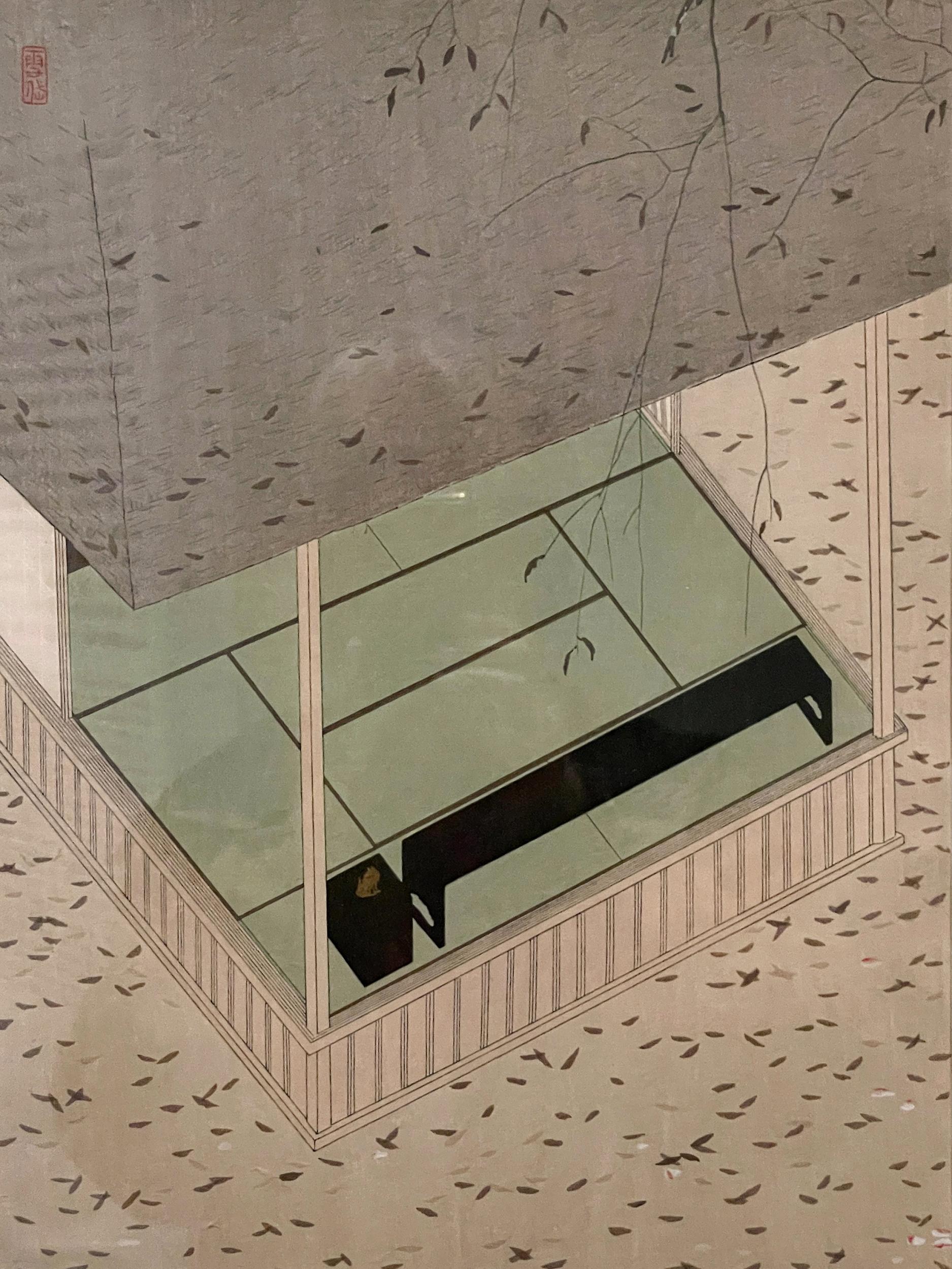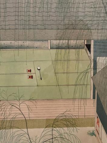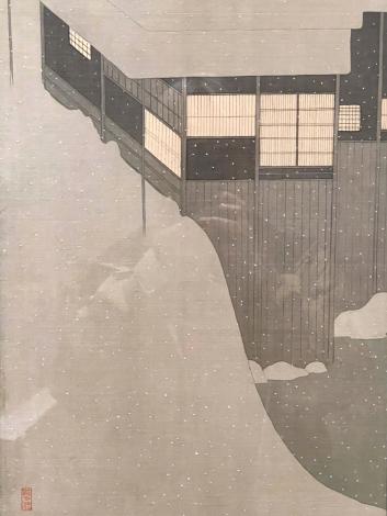 撮影OKの木版画3点、三味線と鼓がポツンと置かれた広い座敷にか細い柳のしなだれかかる「青柳」、三方を庭に囲まれた奇妙な造りの座敷にえらく長細い文台が置かれた「落葉」、一階が雪に埋もれた雪国の宿の障子の細い線が美しい「雪の朝」。これは何だろう何があったんだろうと想像を膨らませてしまう3点です。