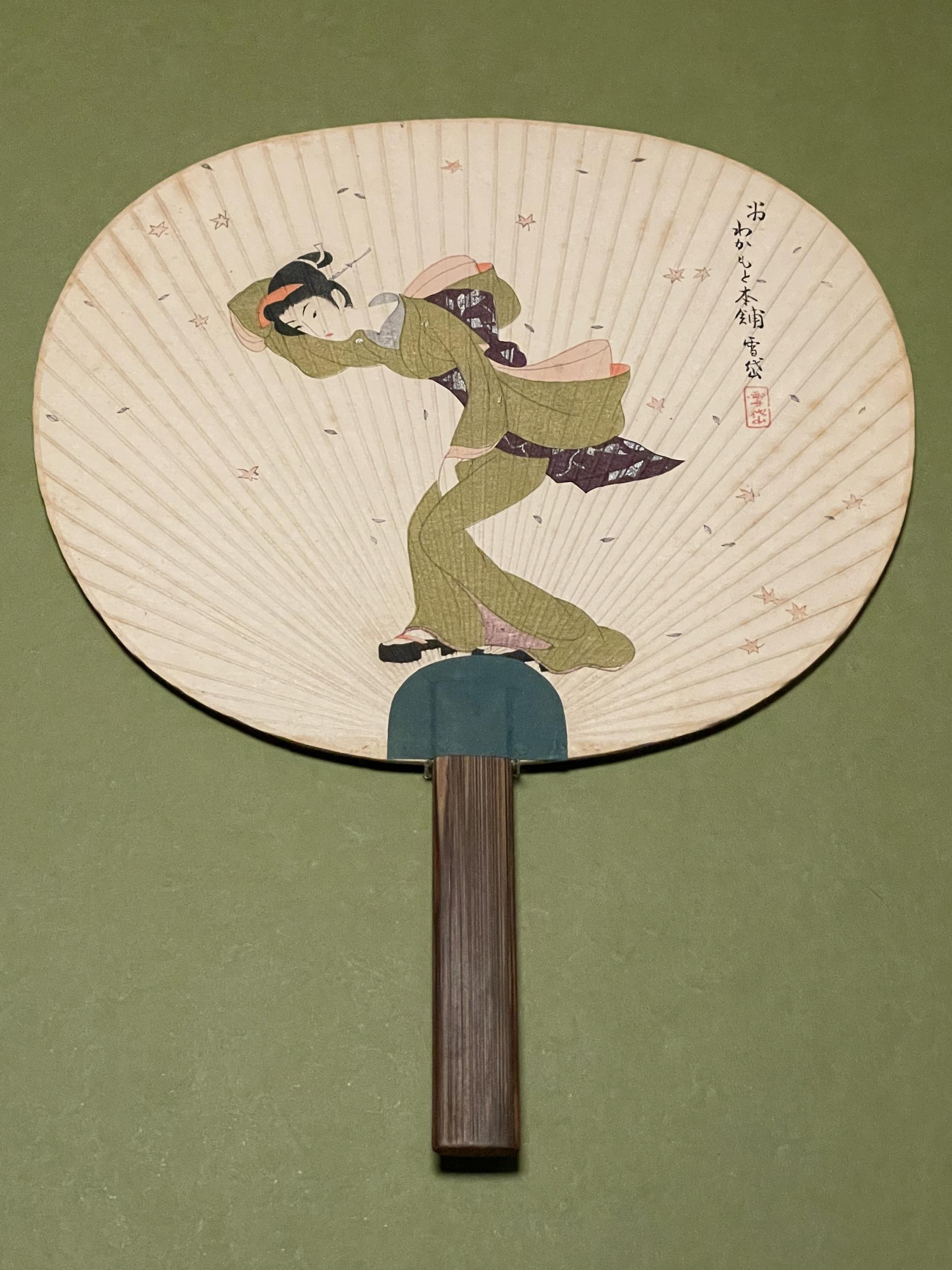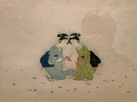 撮影OKの木版画2点、嵯峨嵐山文華館で川又常正の同名作品を見た「見立寒山拾得」。右側の葉っぱに詩を書いているが見立寒山。左が相棒の拾得。もう一枚は「雪兎」、女性の手にちっちゃなウサギさんが。
