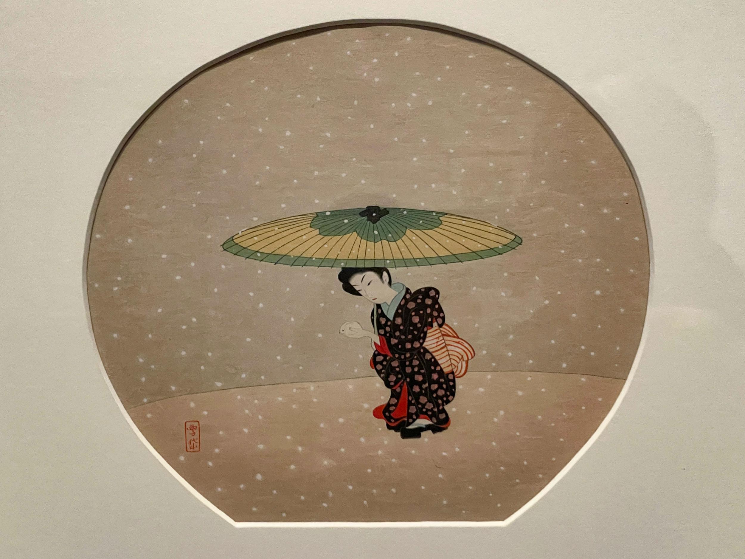 エレベーターで16階に上がって「小村雪岱のすべて」。名前も知らなかった大正〜戦前期に活躍した日本画家、装幀家、舞台美術家の展覧会。チラシの傘の絵のように、昭和の鈴木春信とも呼ばれる線の美しさ、絶妙な余白に惹かれやってきた次第です。