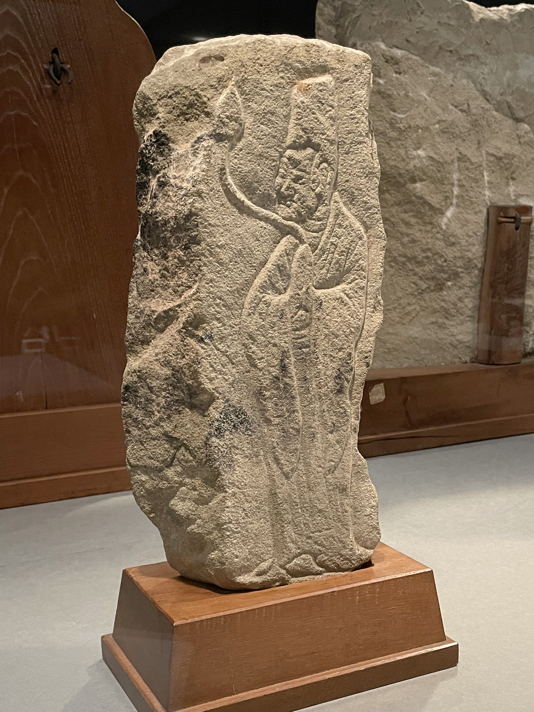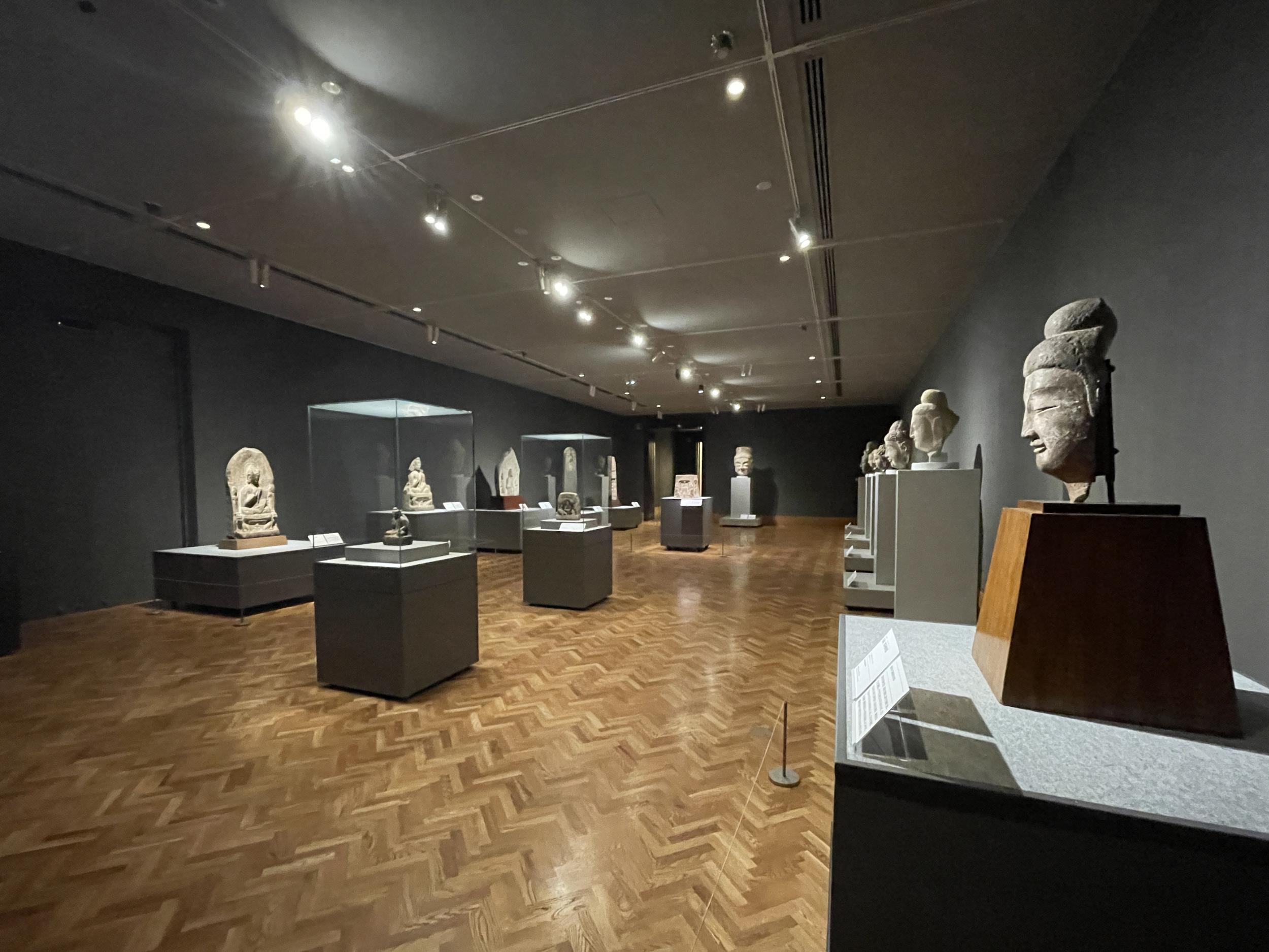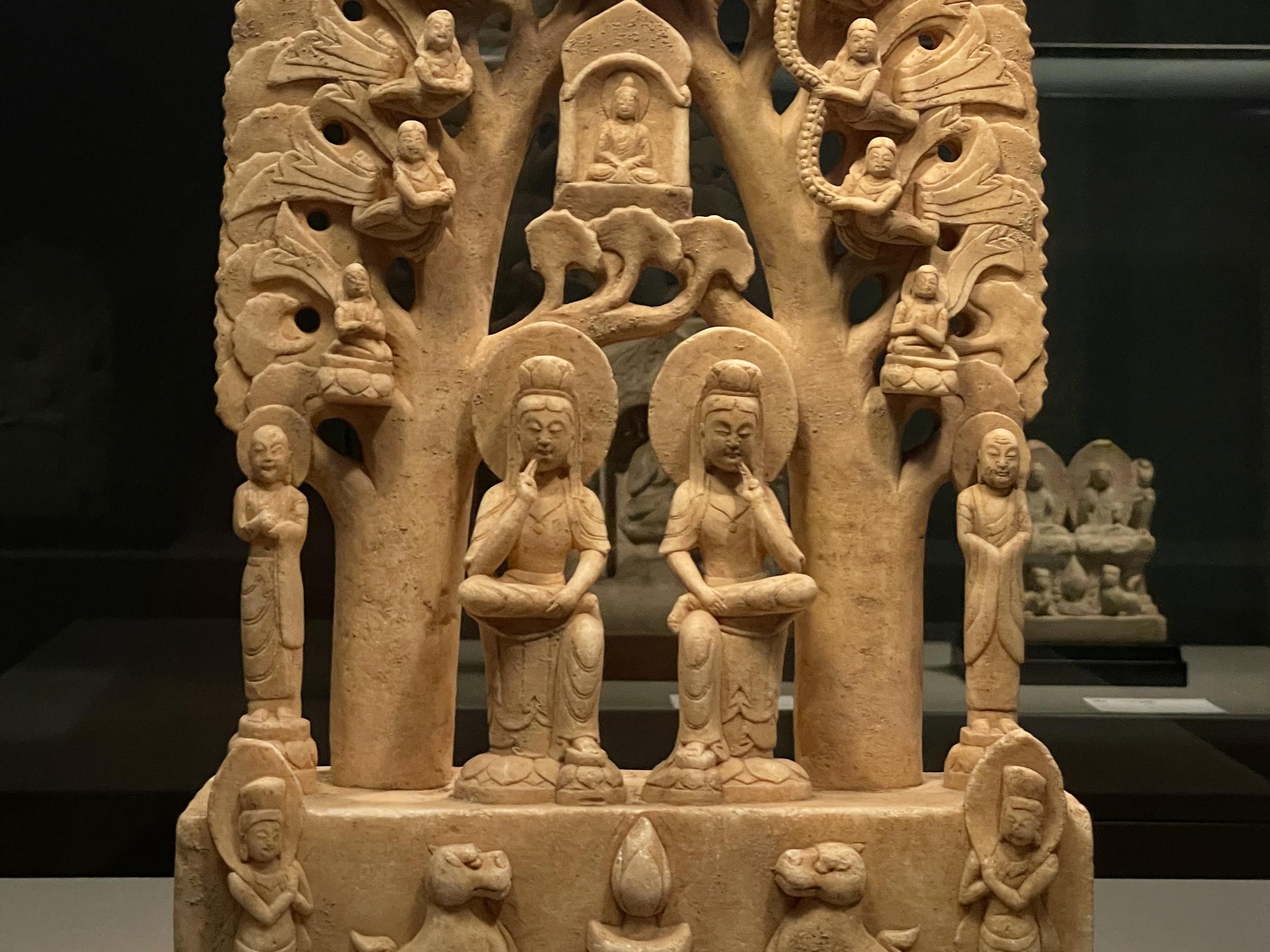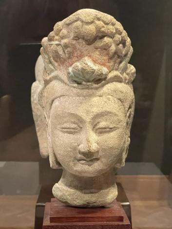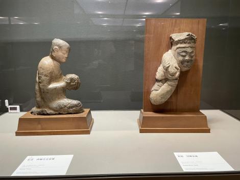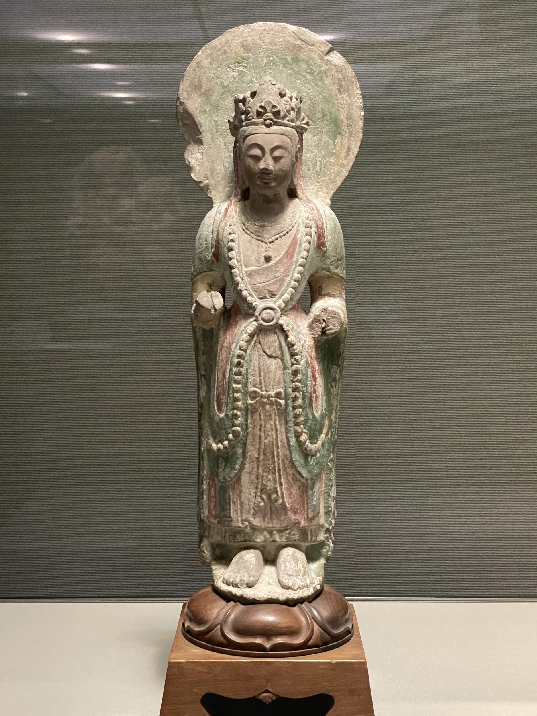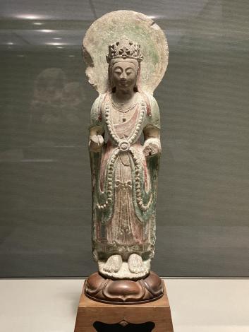 1500年前の人とコミュニケーションできたような気がします。菱形に削られた右端の一尊が欠けてしまっているのは菩薩五尊像(北斉)、緑と赤の着色が残る円筒状の石像は菩薩立像(北斉〜隋)。