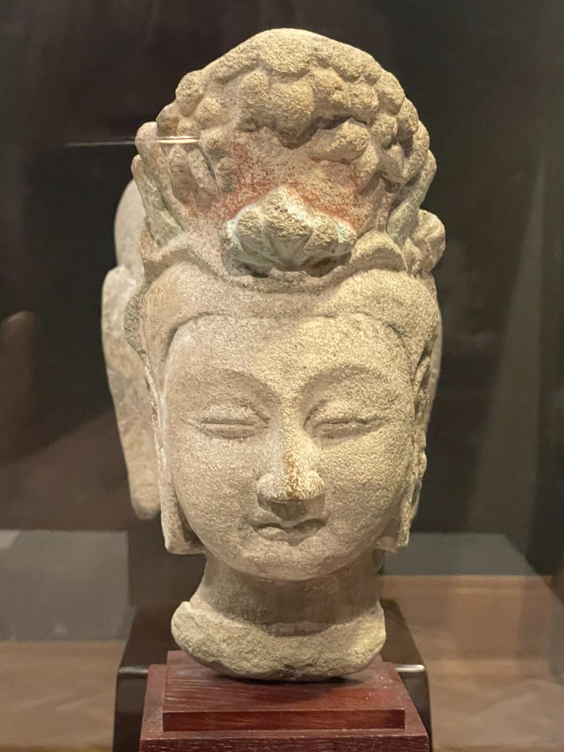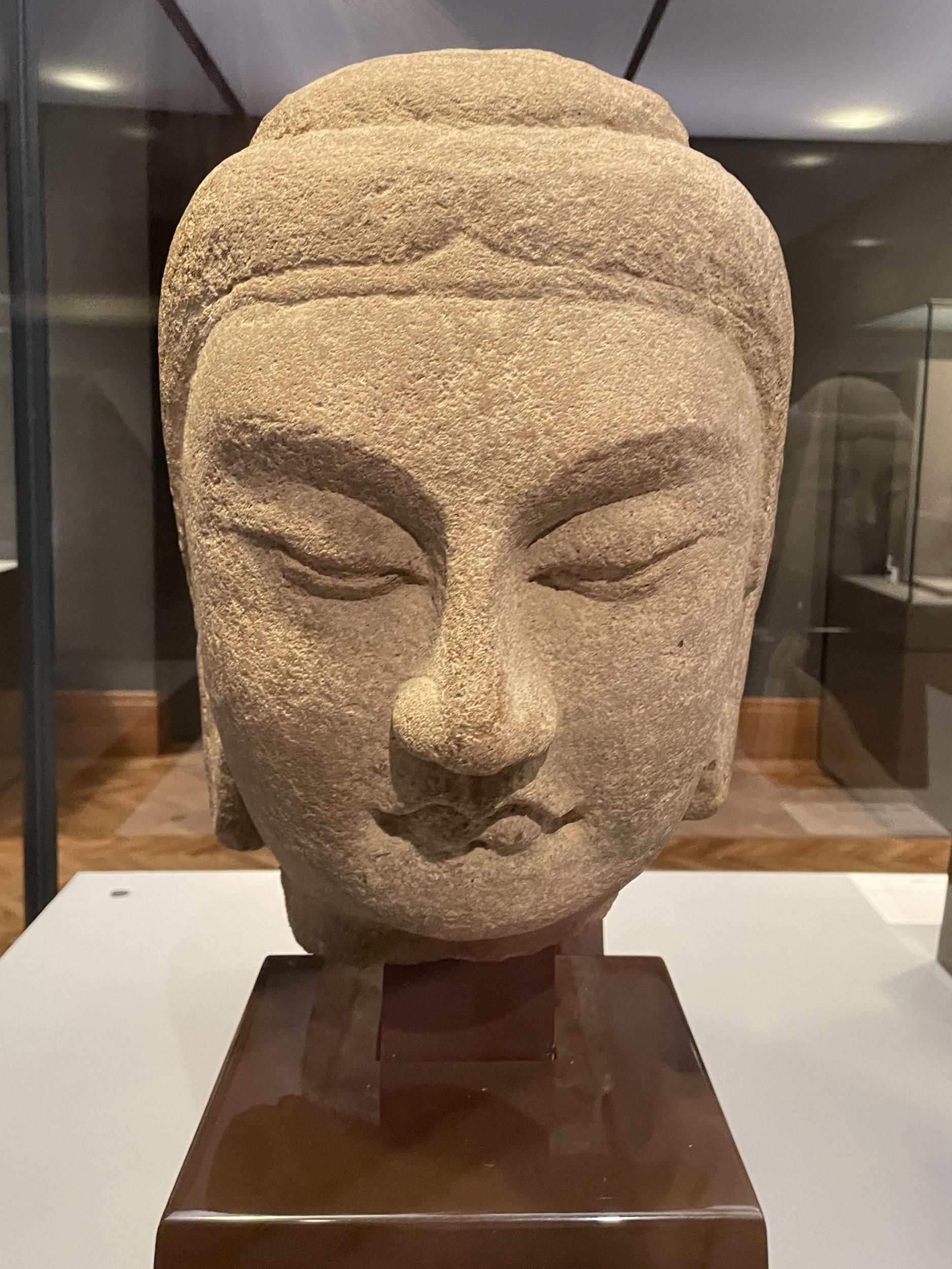 北斉時代(550〜577年)第1窟西壁にあった如来坐像頭部、第1窟ページの最後の写真、あるいは写真集天龍山石窟PDF17ページに鎮座している仏像で間違いなさそうです。同じく北斉時代の第16窟北壁の菩薩頭部は少し小ぶりで、宝冠(菩薩冠)を戴いた修行中の貴族がモデルと思われます。