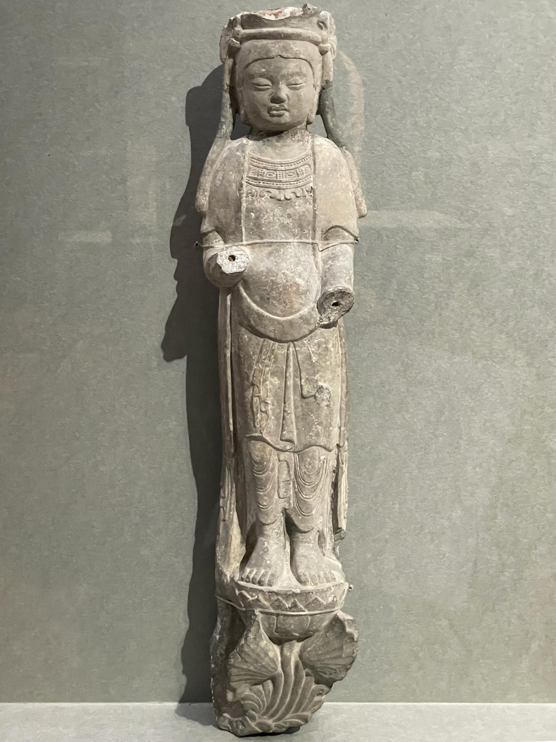 北斉の蓮の花にのった菩薩立像、Geminiによると、目を細めかすかな微笑みを浮かべ、内省的で静謐な美しさを湛えた表情は北斉彫刻に共通する特徴、衣が濡れて体に密着しているような質感の表現は「曹衣出水」と呼ばれる北斉の描画様式だそうです。北斉は短命な王朝も、仏教美術においては「北斉様式」と呼ばれる独自の頂点を極め、後の隋や日本の飛鳥・奈良時代の仏像制作にも大きな影響を与えたと考えられているとのこと。
